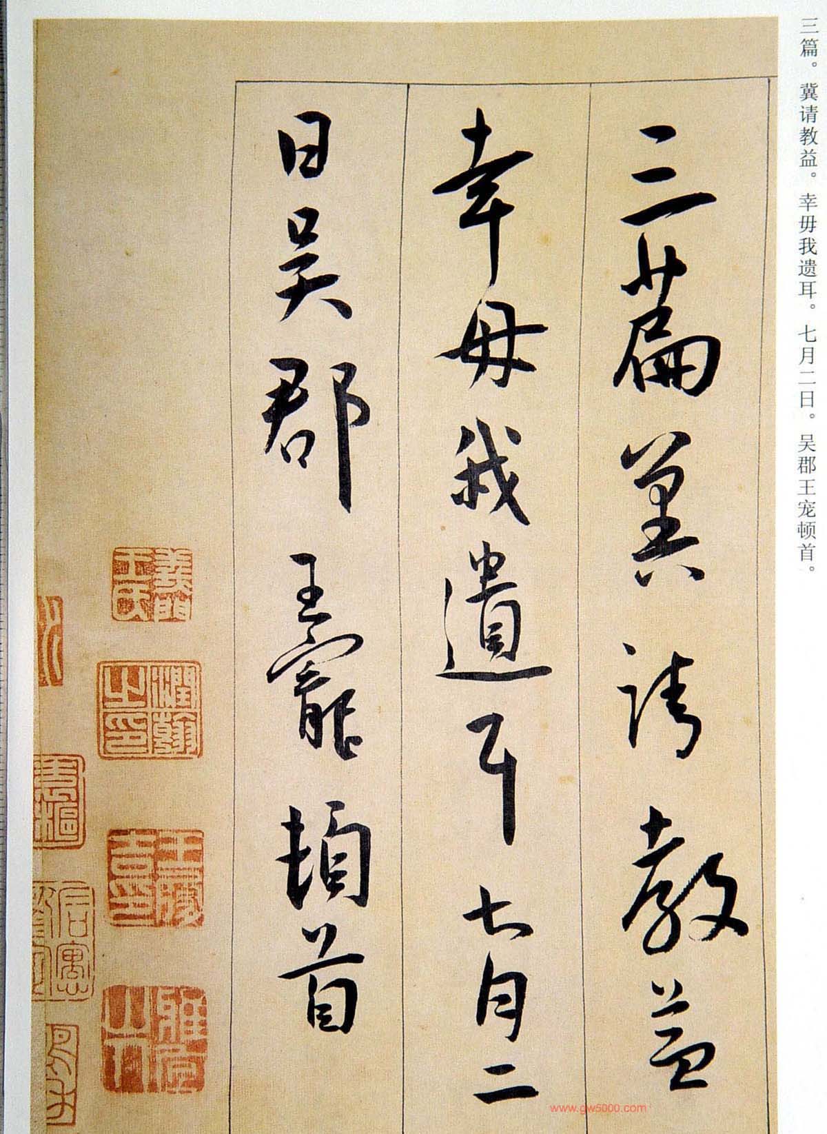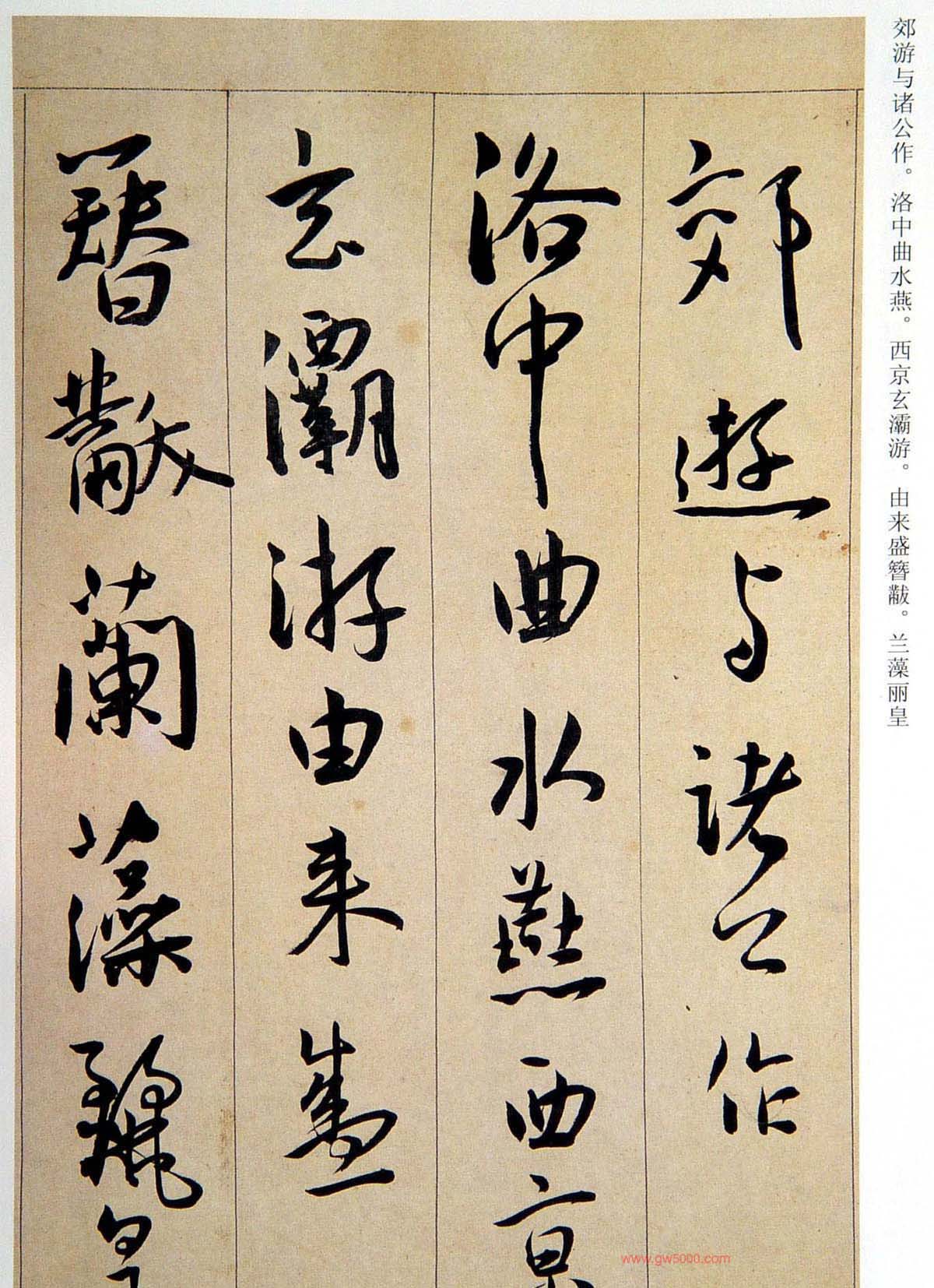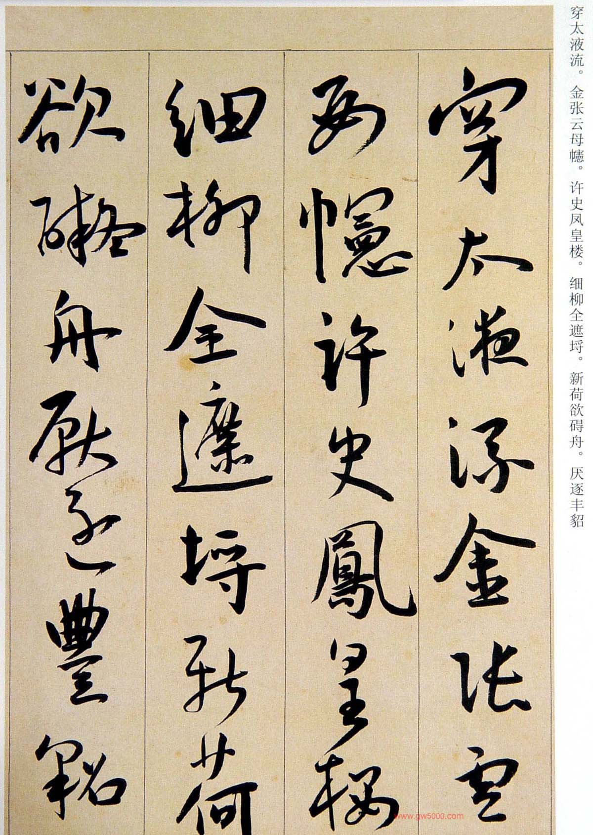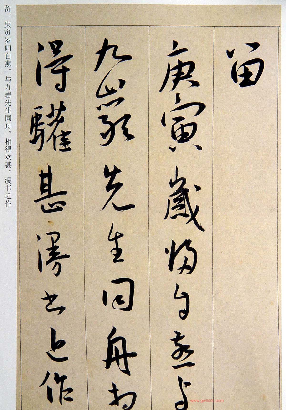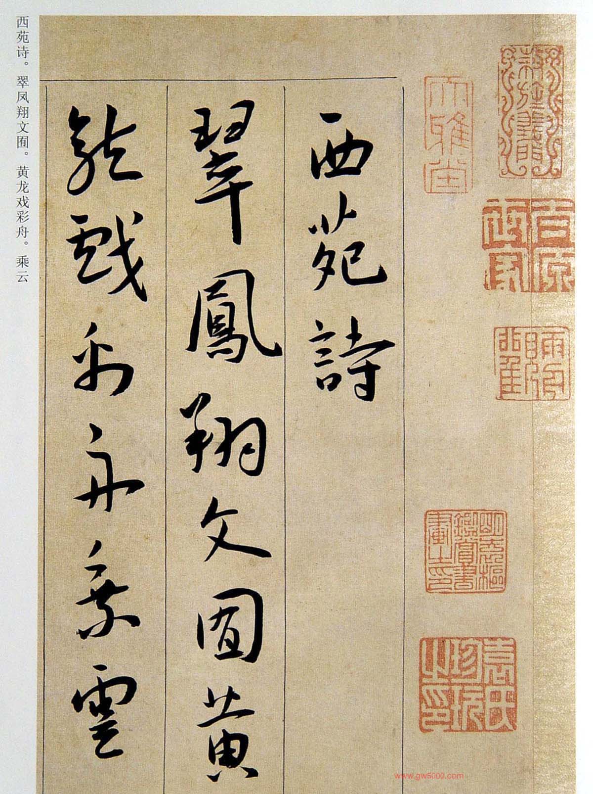 《西苑诗》,取法献之、虞世南笔意,但善于掺拙,做到了巧而不媚,流畅而不浮滑;用笔清劲秀雅,温润含蓄,不激不厉,技巧动作的表达非常细腻、精巧,变化极其微妙;结体安排精巧流走,法度、情性俱在,有些地方还流露章草遗韵,更显高古蕴藉;整个气息落拓不羁、遒劲萧疏,在沉静、收敛之中反而更具一种内在的张力。诚如清黎惟敬所赞颂的那样:“晋人真迹,世所罕见。所传者,仿书耳。诸体混淆,若出一手,不辨其为谁也。近世吴人王履古氏独能追踪大令,萧散俊逸,复出流辈,虽不见晋人书,知其为绝艺也。”
