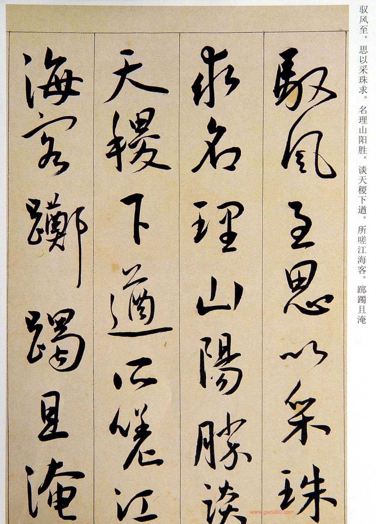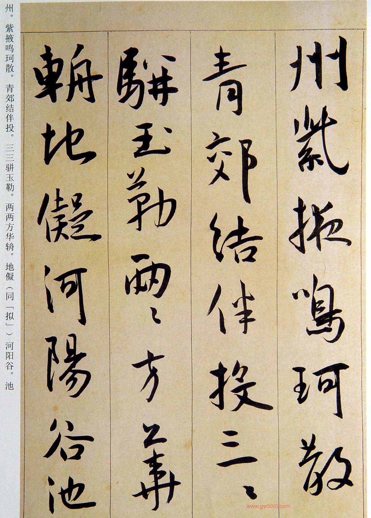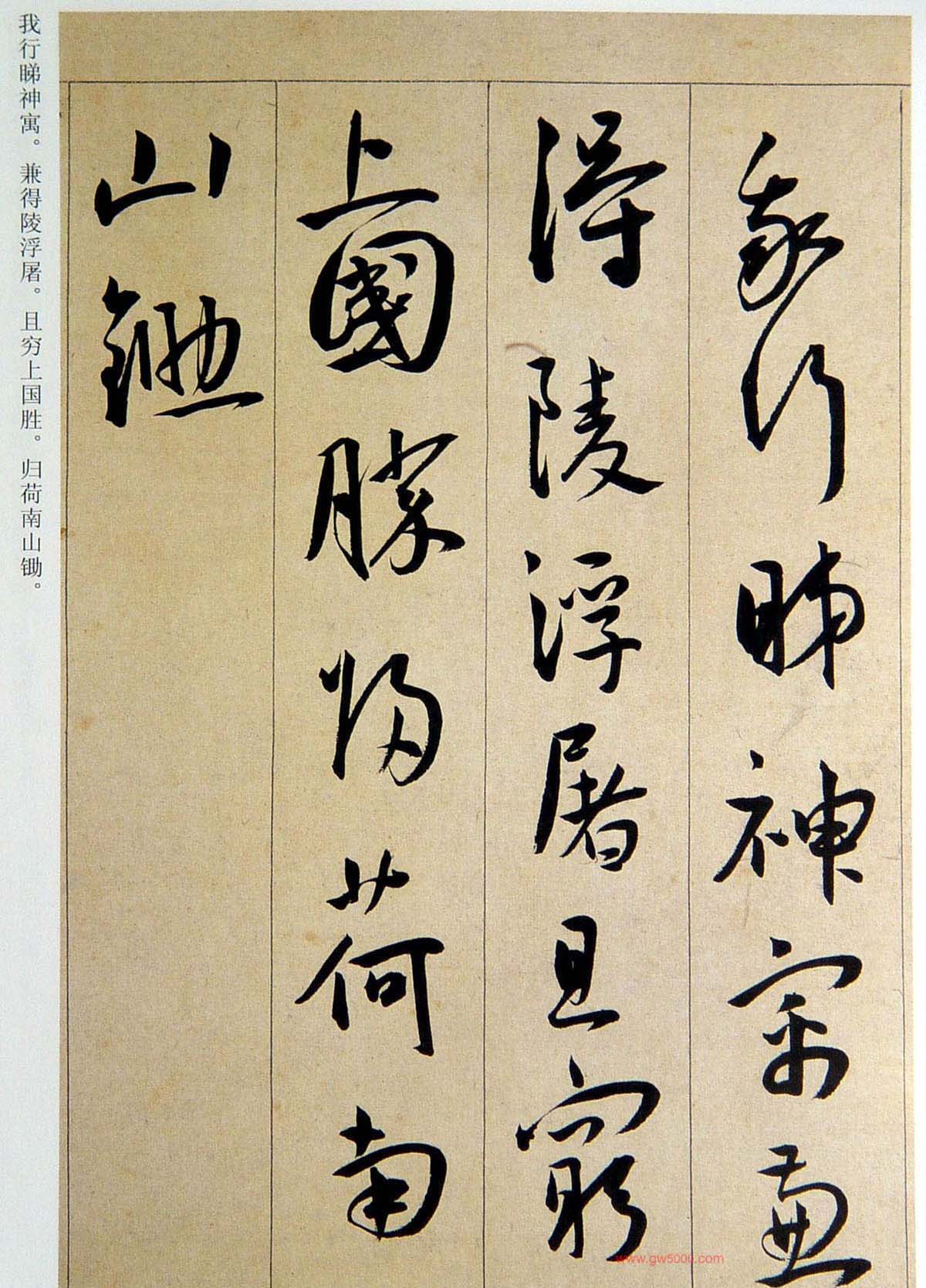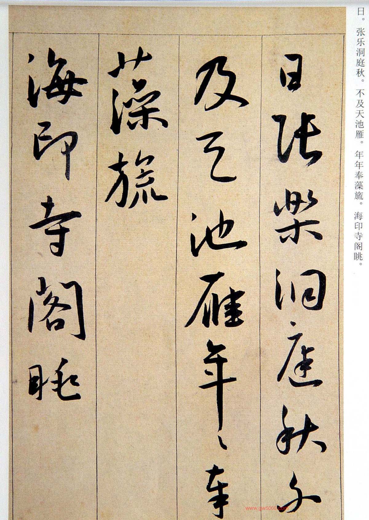 《西苑诗》,取法献之、虞世南笔意,但善于掺拙,做到了巧而不媚,流畅而不浮滑;用笔清劲秀雅,温润含蓄,不激不厉,技巧动作的表达非常细腻、精巧,变化极其微妙;结体安排精巧流走,法度、情性俱在,有些地方还流露章草遗韵,更显高古蕴藉;整个气息落拓不羁、遒劲萧疏,在沉静、收敛之中反而更具一种内在的张力。诚如清黎惟敬所赞颂的那样:“晋人真迹,世所罕见。所传者,仿书耳。诸体混淆,若出一手,不辨其为谁也。近世吴人王履古氏独能追踪大令,萧散俊逸,复出流辈,虽不见晋人书,知其为绝艺也。”