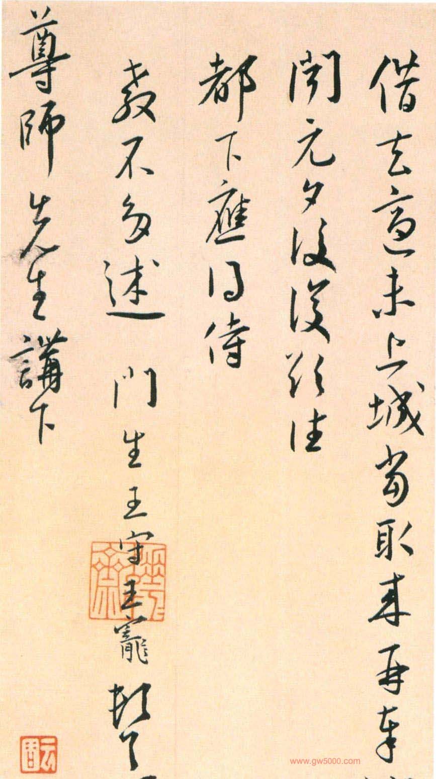 王宠行草书墨迹欣赏《致尊师书札》,现藏于浙江省博物馆的雅宜山人书札共两页,每页纵22.7厘米、横12.2厘米,钤“韡韡斋”朱文印、“云谷”朱白文方印、“曾藏丁辅之处”朱文长方印。此作以韵写拙,拙中见雅,追求细腻精致、丰富多变的笔法,因而能流动畅达、格调高古。