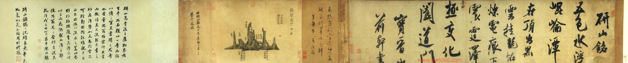 释文:研山铭。五色水,浮昆仑。潭在顶,出黑云。挂龙怪,烁电痕。下震霆,泽厚坤。极变化,阖道门。宝晋山前轩书。