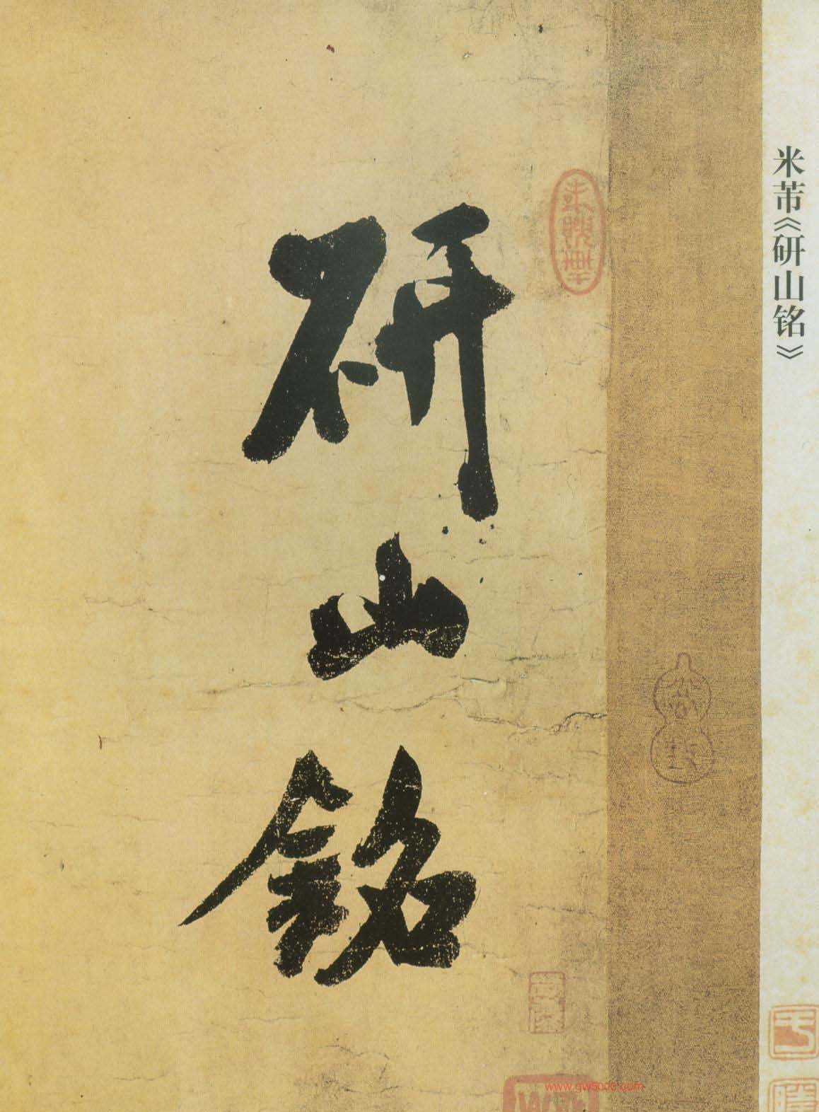 米芾《研山帖》,行书墨迹。在明代张丑的《真迹目录初集》、《清河书画表》和清代吴其贞的《吴氏书画记》中都有记载,据推创作于1101年至1102年间,作品沉雄苍劲、挥洒纵横,是米芾晚年代表作之一。专家研究说,作品早年曾入藏宋代内府,后一直为民间文人雅士珍藏。上个世纪20年代被日本一家博物馆收购而东渡扶桑。