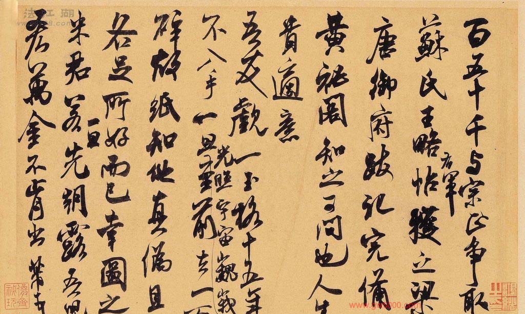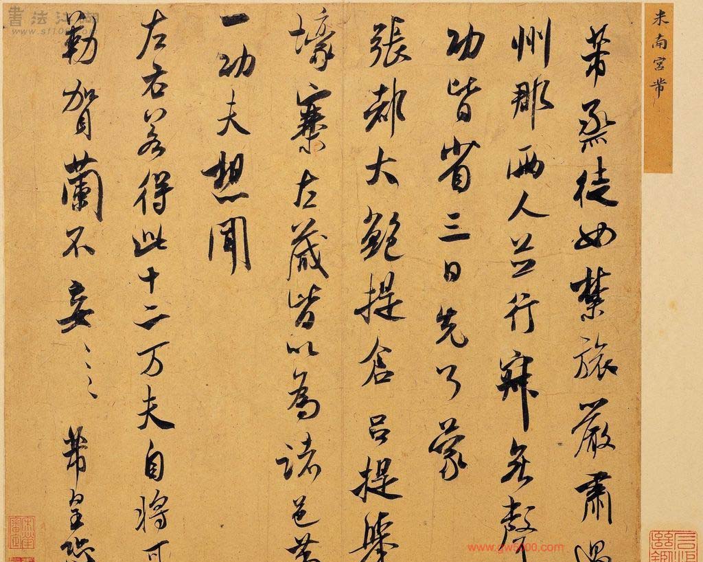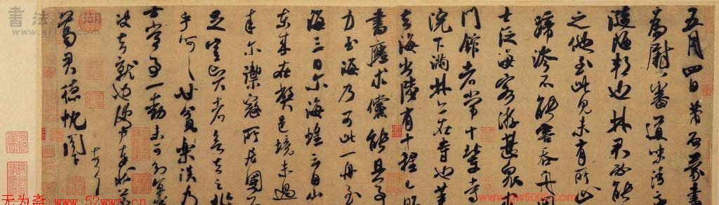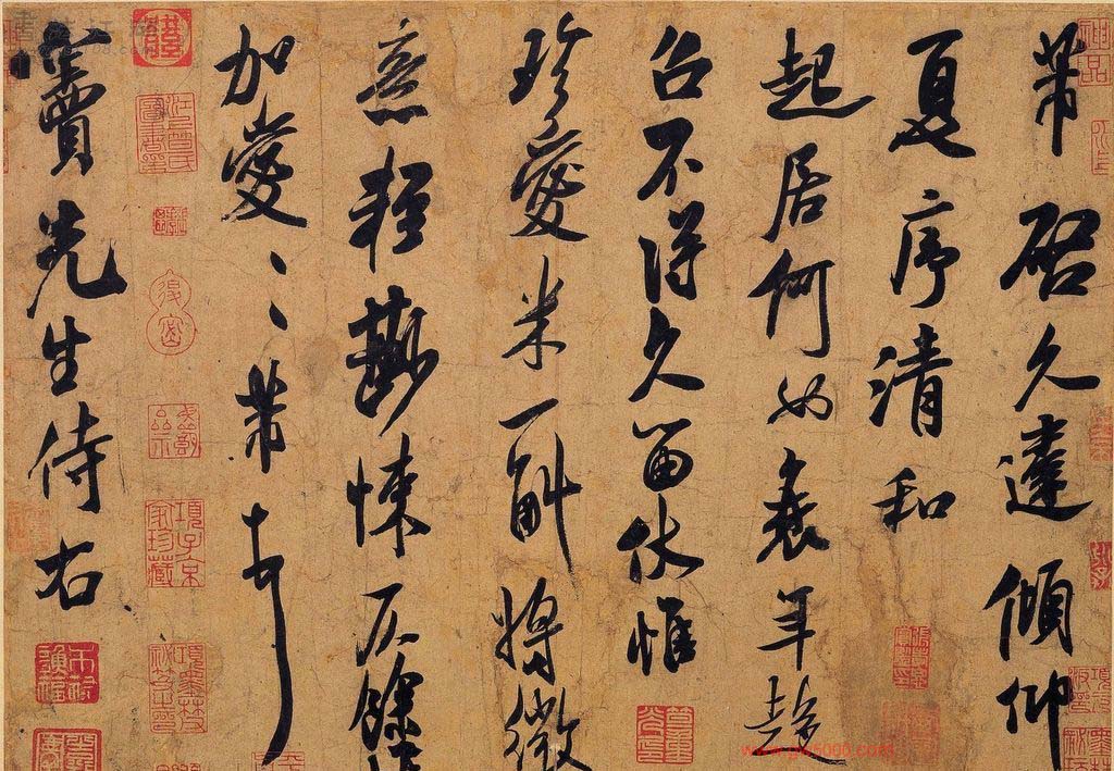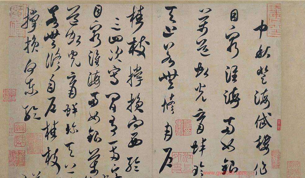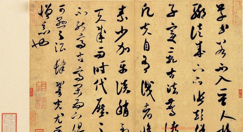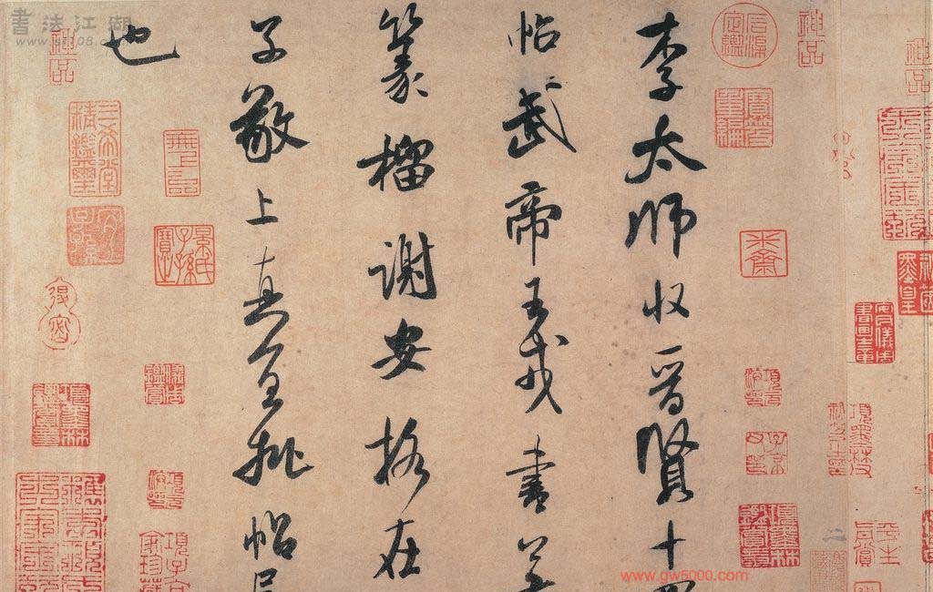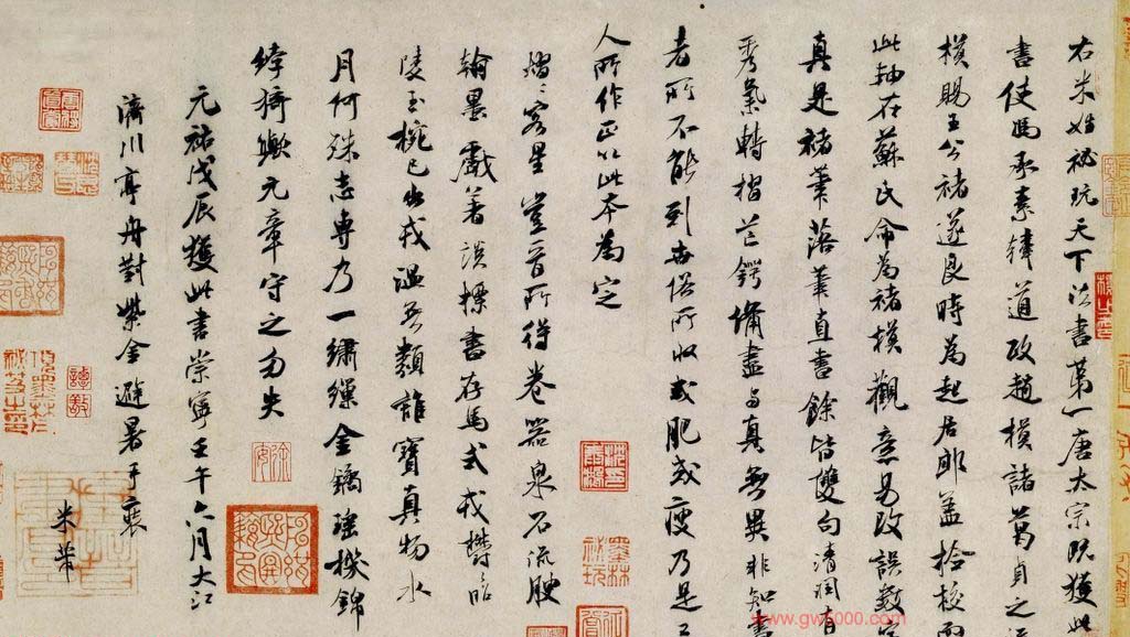 米芾习书,自称“集古字”,虽有人以为笑柄,也有赞美说“天姿辕轹未须夸,集古终能自立家”(王文治)。这从一定程度上说明了米氏书法成功的来由。根据米芾自述,在听从苏东坡学习晋书以前,大致可以看出他受五位唐人的影响最深:颜真卿、欧阳询、褚遂良、沈传师、段季展。米芾有很多特殊的笔法,如“门”字右角的圆转、竖钩的陡起以及蟹爪钩等,都集自颜之行书;外形竦削的体势,当来自欧字的模仿,并保持了相当长的一段时间;沈传师的行书面目或与褚遂良相似;米芾大字学段季展,“独有四面”、“刷字”也许来源于此;褚遂良的用笔最富变化,结体也最为生动,合米芾的脾胃,曾赞其字,“如熟驭阵马,举动随人,而别有一种骄色”。