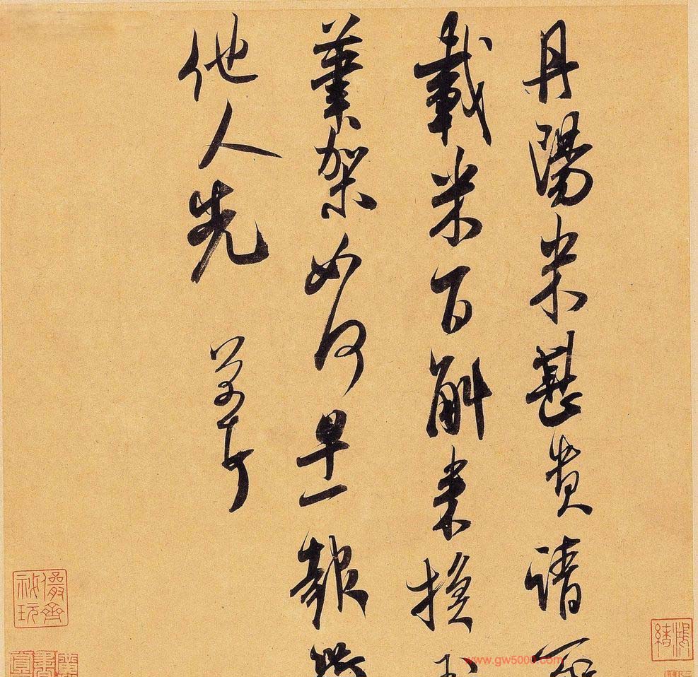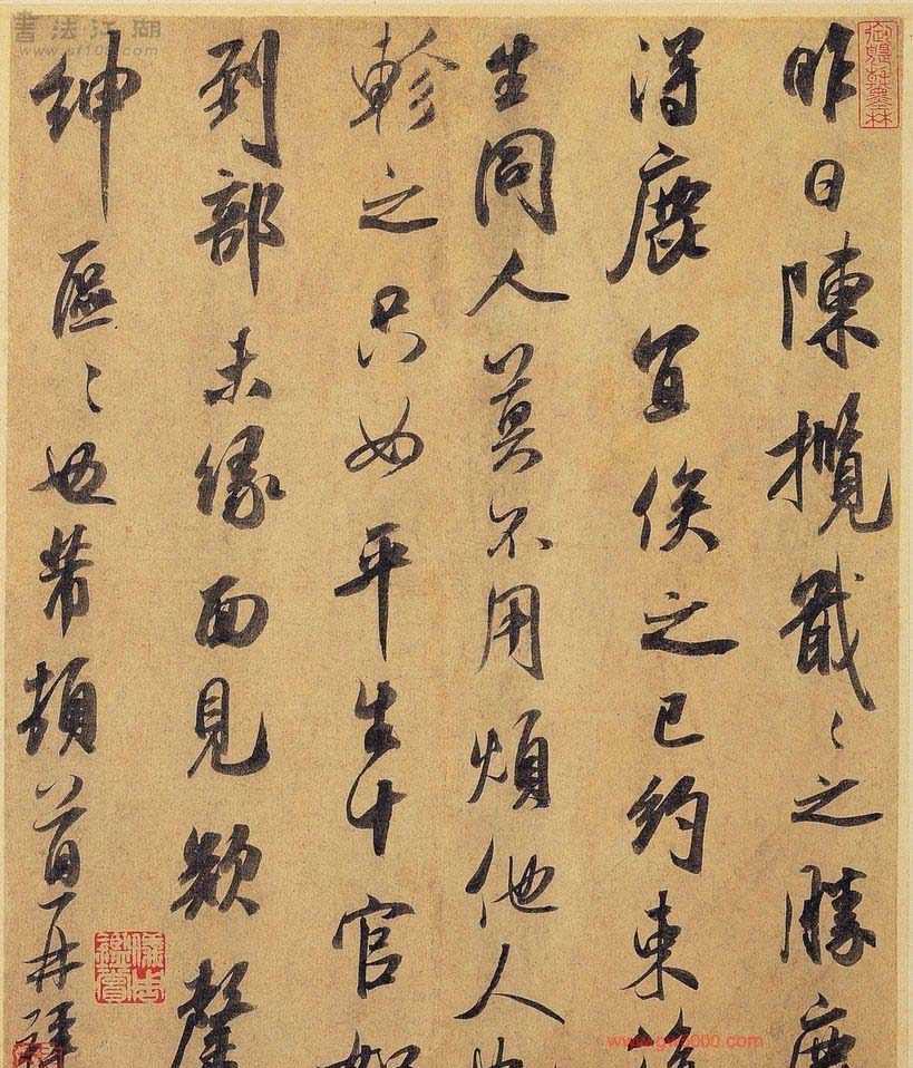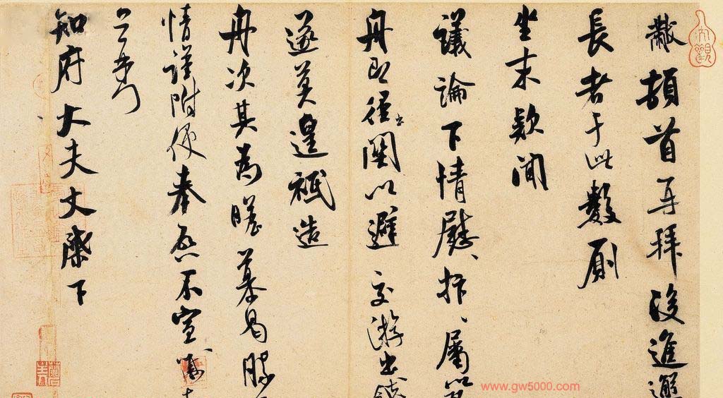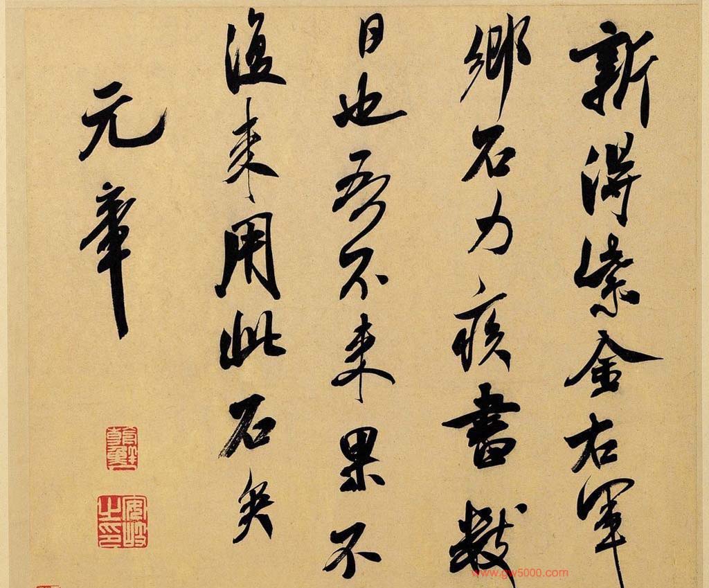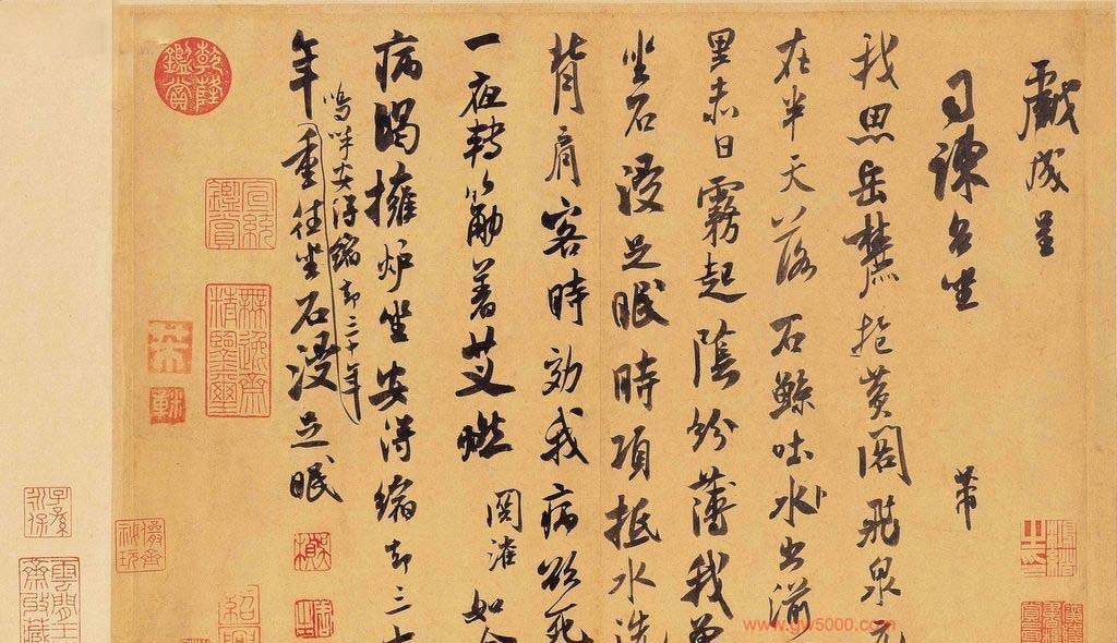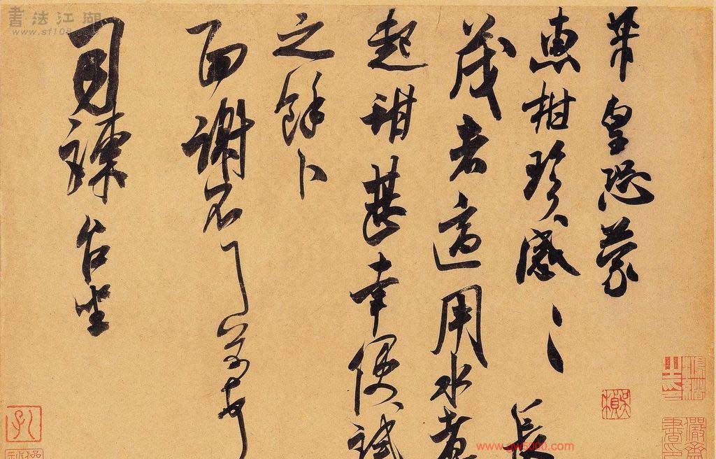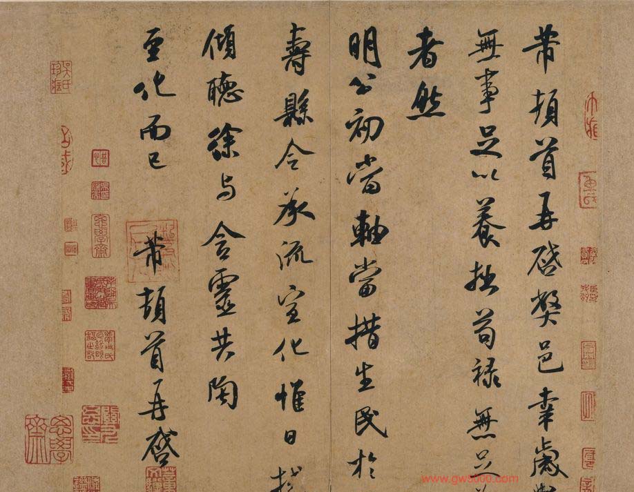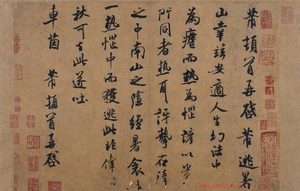 米芾习书,自称“集古字”,虽有人以为笑柄,也有赞美说“天姿辕轹未须夸,集古终能自立家”(王文治)。这从一定程度上说明了米氏书法成功的来由。根据米芾自述,在听从苏东坡学习晋书以前,大致可以看出他受五位唐人的影响最深:颜真卿、欧阳询、褚遂良、沈传师、段季展。米芾有很多特殊的笔法,如“门”字右角的圆转、竖钩的陡起以及蟹爪钩等,都集自颜之行书;外形竦削的体势,当来自欧字的模仿,并保持了相当长的一段时间;沈传师的行书面目或与褚遂良相似;米芾大字学段季展,“独有四面”、“刷字”也许来源于此;褚遂良的用笔最富变化,结体也最为生动,合米芾的脾胃,曾赞其字,“如熟驭阵马,举动随人,而别有一种骄色”。