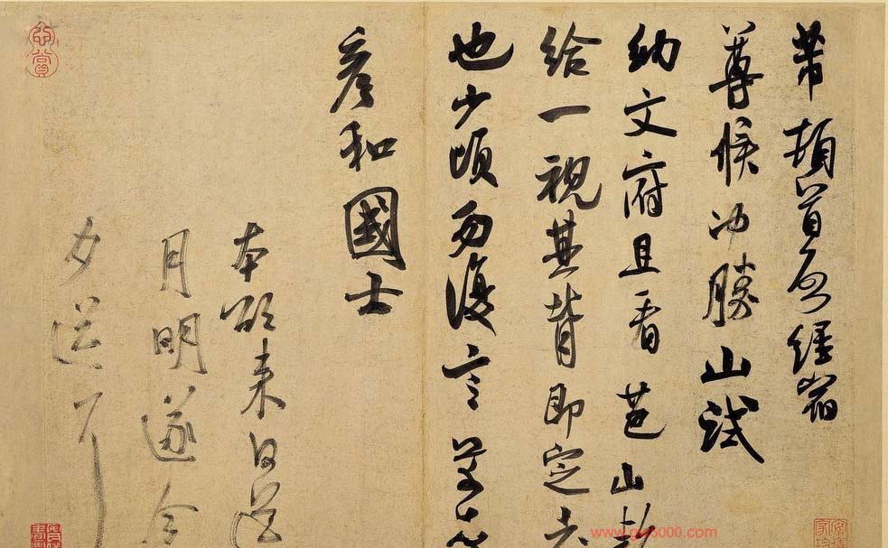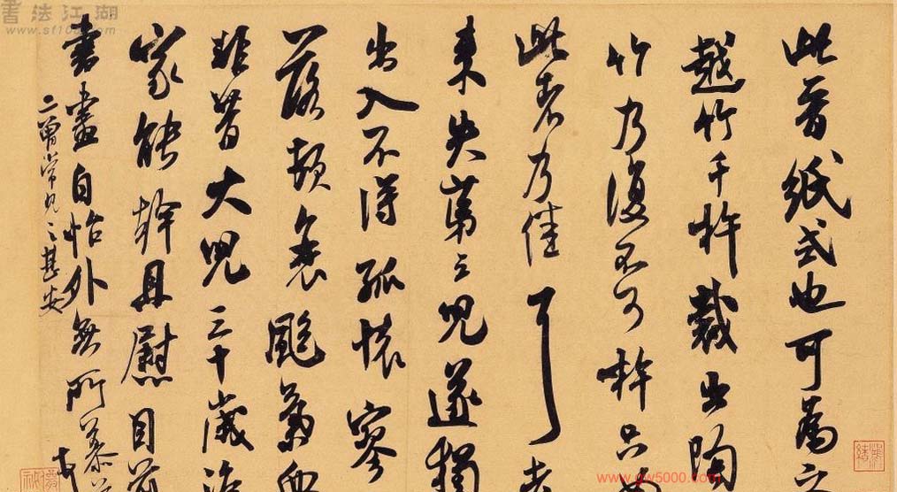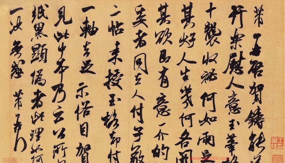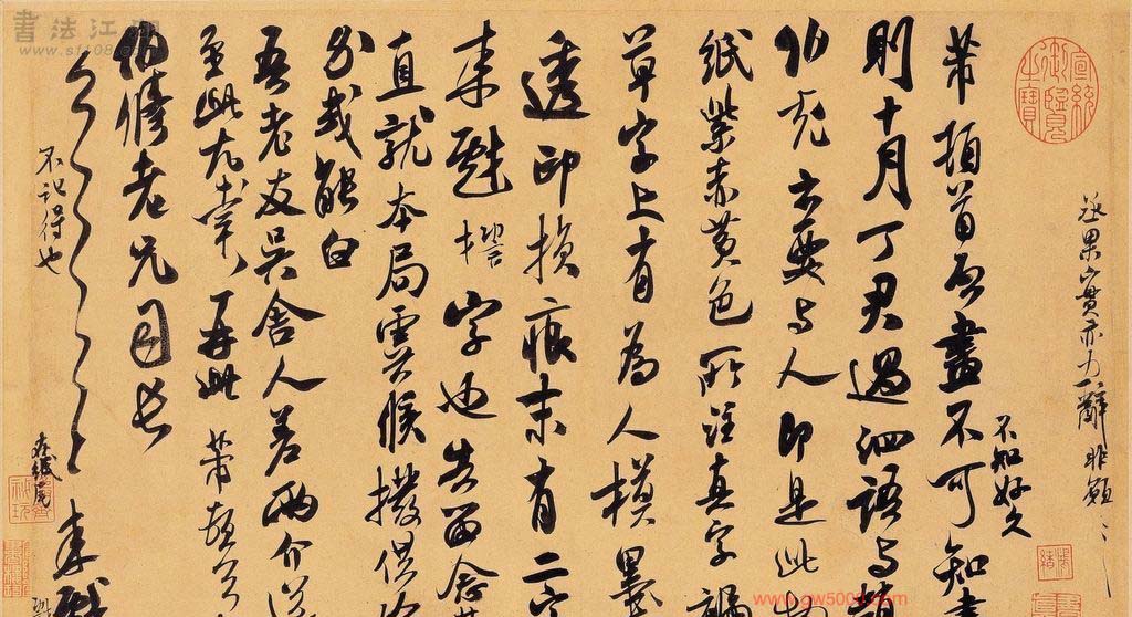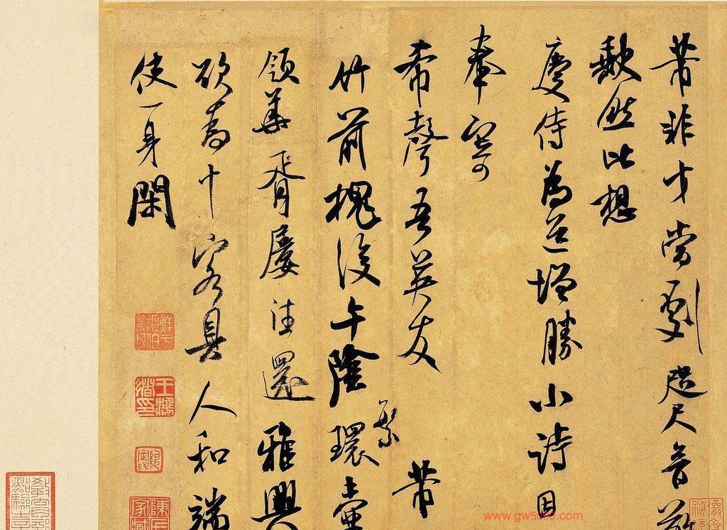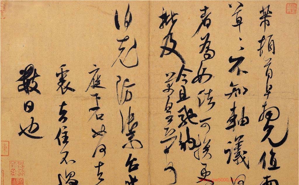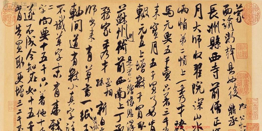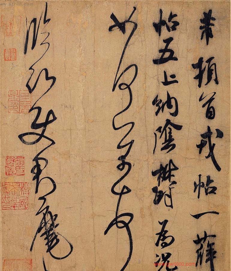 米芾习书,自称“集古字”,虽有人以为笑柄,也有赞美说“天姿辕轹未须夸,集古终能自立家”(王文治)。这从一定程度上说明了米氏书法成功的来由。根据米芾自述,在听从苏东坡学习晋书以前,大致可以看出他受五位唐人的影响最深:颜真卿、欧阳询、褚遂良、沈传师、段季展。米芾有很多特殊的笔法,如“门”字右角的圆转、竖钩的陡起以及蟹爪钩等,都集自颜之行书;外形竦削的体势,当来自欧字的模仿,并保持了相当长的一段时间;沈传师的行书面目或与褚遂良相似;米芾大字学段季展,“独有四面”、“刷字”也许来源于此;褚遂良的用笔最富变化,结体也最为生动,合米芾的脾胃,曾赞其字,“如熟驭阵马,举动随人,而别有一种骄色”。