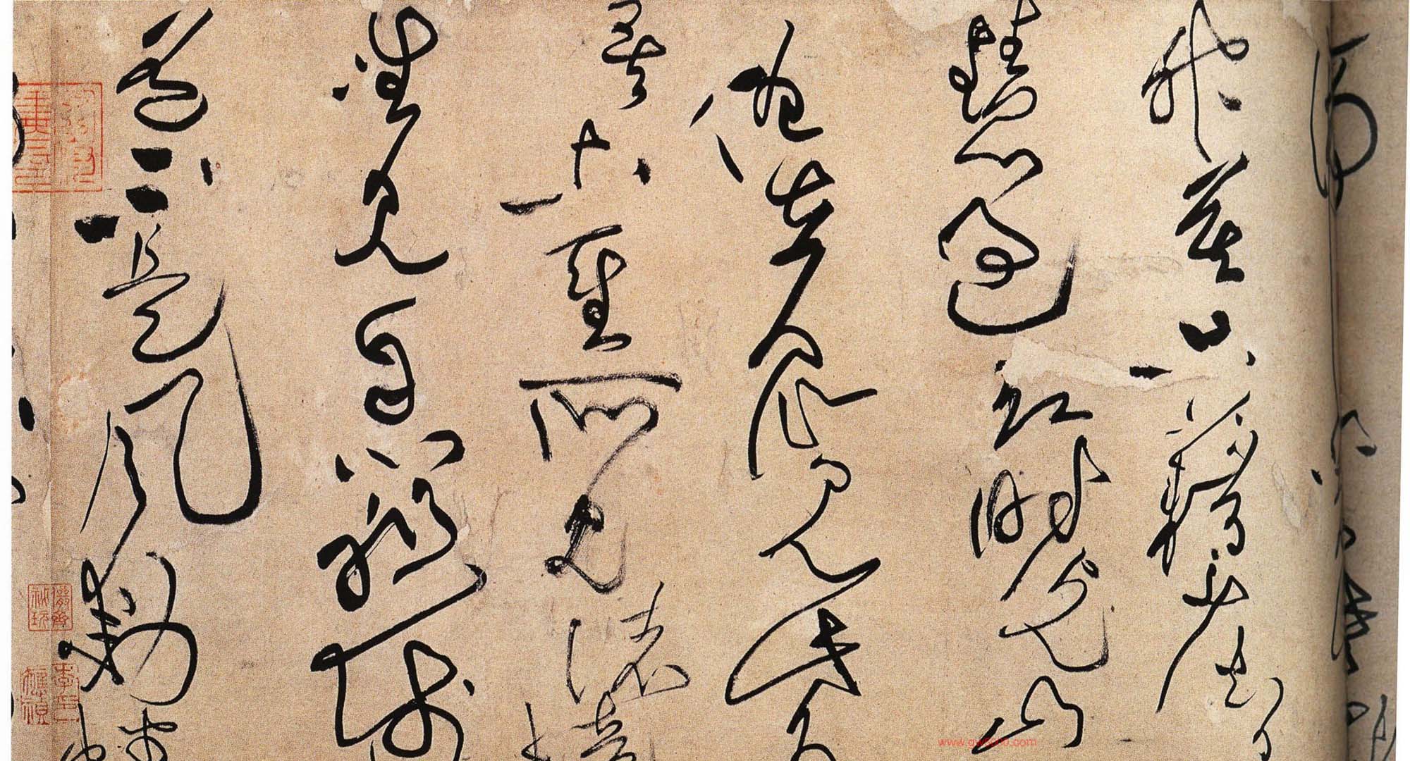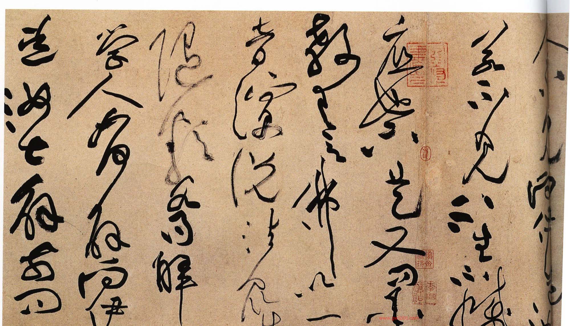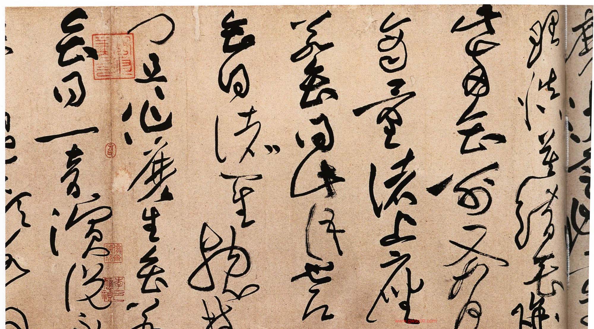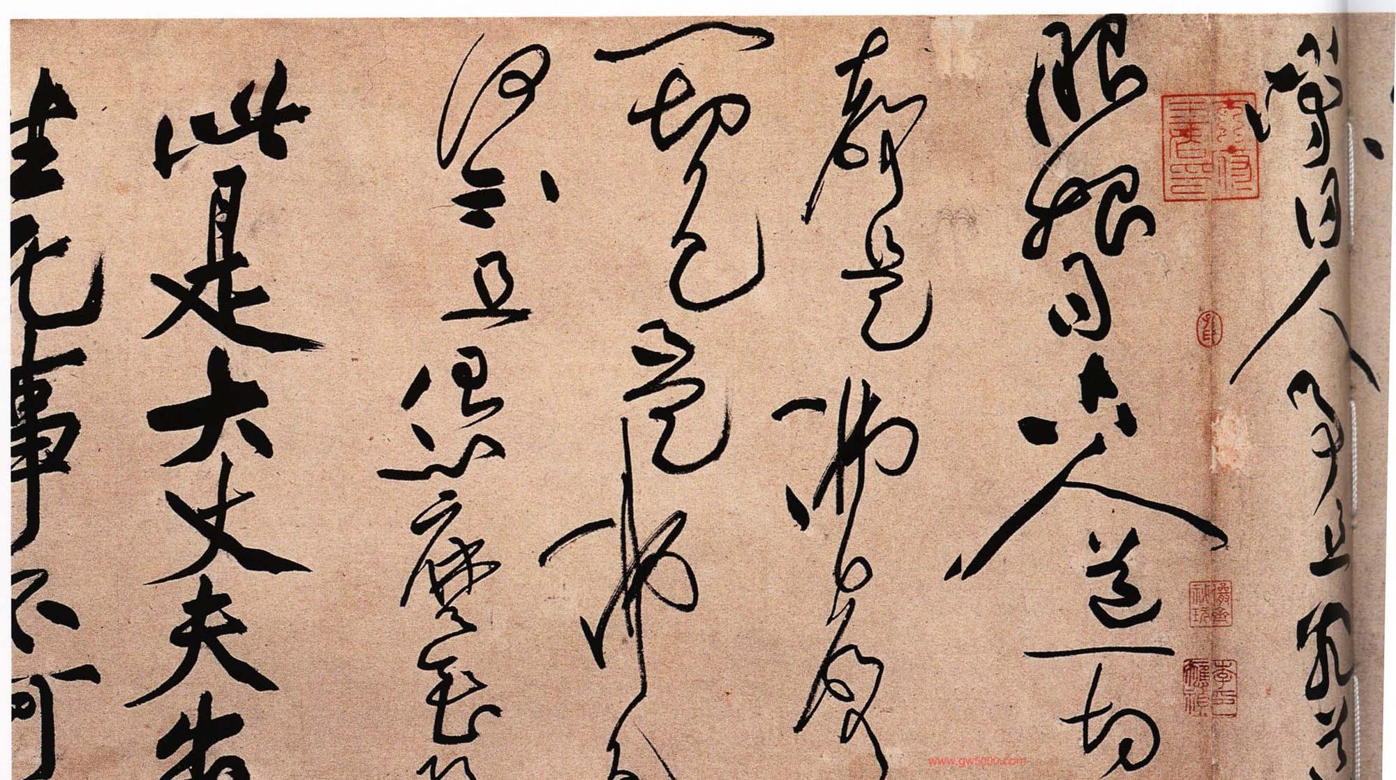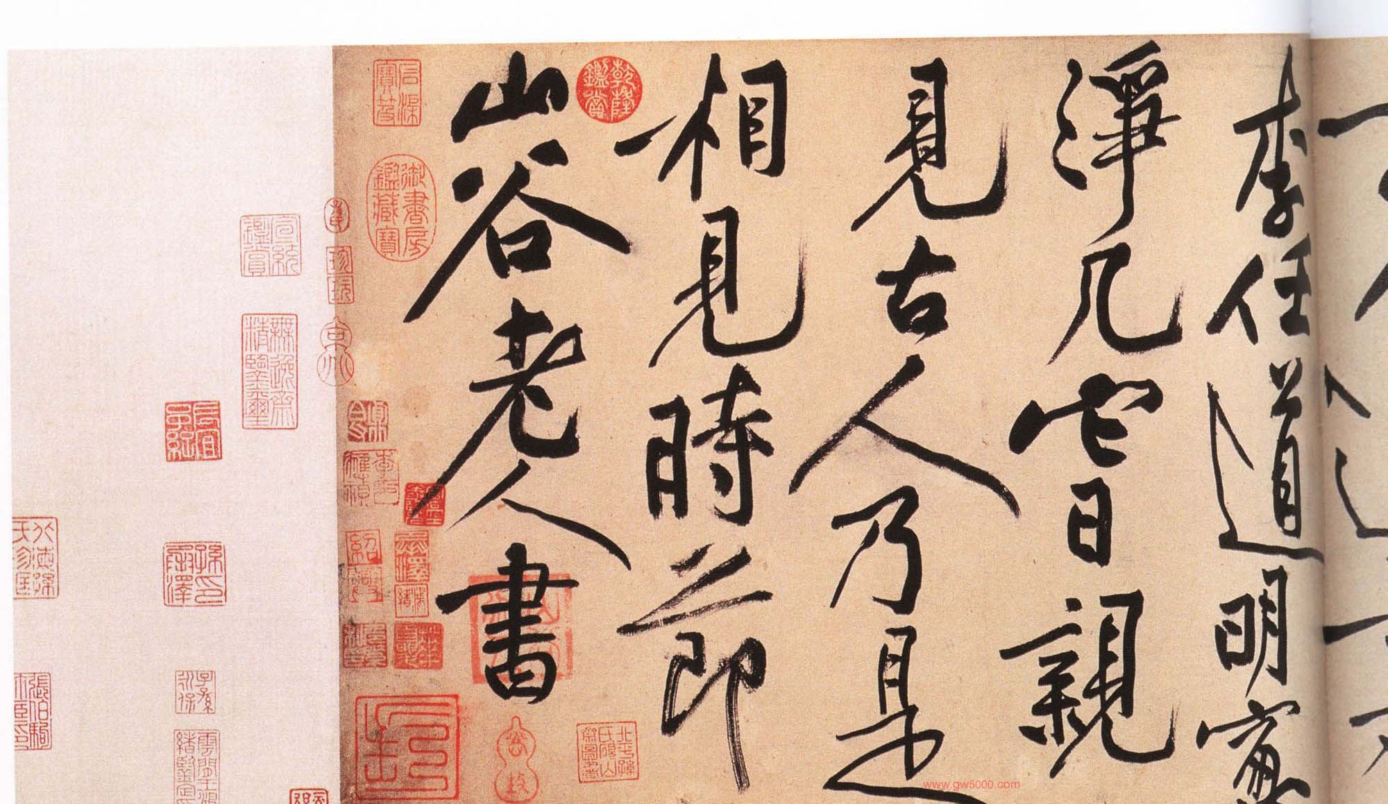 黄庭坚书法长卷《诸上座草书卷》,约书于元符三年(1100年),纸本,草书。凡九十二行,四百七十七字,33X729.5厘米。署款:“山谷老人書。”“书”字上钤“山谷道人”朱文方玺。后纸有明吴宽,清梁清标题跋各一段。卷前后及隔水上钤宋“内府书印”、“绍兴”、“悦生”,元“危素私印”,明李应祯、华夏、周亮工,清孙承泽、王鸿绪,近代张伯驹等鉴藏印。此帖初藏南宋高宗内府,后归贾似道,明代递藏于李应祯、华夏、周亮工处,清初藏孙承泽砚山斋,后归王鸿绪,乾隆时收入内府,至清末流出宫外,为张伯驹先生所得,后捐献给国家,现藏北京故宫博物院。