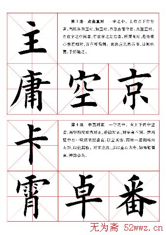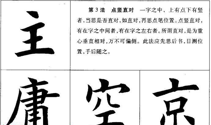 第3法 点竖直对 一字之中,上有点下有竖者,当思是否直对,如直对,再思点笔位置。点竖直对,有在字之中间者,有在字之左右者。所谓直对,是为 重心垂直相对,万不可偏侧。此法应先思后书,目测位置,手后随之。