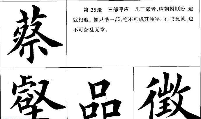 第25法 三部呼应 凡三部者,应朝揖顾盼,避就相迎。如只书一部,绝不可成其独字。行书急就,也不可杂乱无章。