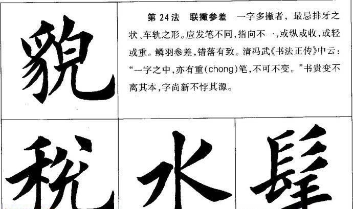 第24法 联撇参差 一字多撇者,最忌排牙之状、车轨之形。应发笔不同,指向不一,或纵或收,或轻或重。鳞羽参差,错落有致。清冯武《书法正传》中 云:“一字之中,亦有重(chong)笔,不可不变。”书贵变不离其本,字尚新不悖其源。
