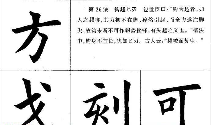 第26法 钩趯匕刃 包世臣曰:“钩为趯者,如人之趯脚,其力初不在脚,猝然引起,而全力遂注脚尖,故钩未断不可作飘势挫锋,有失趯之义也。”楷法 中,钩身不宜长,犹如匕刃。古人云:“趯峻而势生。”