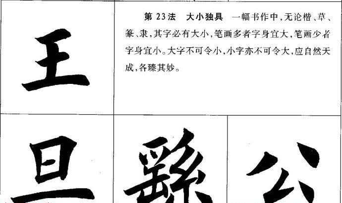 第23法 大小独具 一幅书作中,无论楷、草、篆、隶,其字必有大小,笔画多者字身宜大,笔画小者字身宜小。大字不可令小,小字亦不可令大,应自然 天成,各臻其妙。