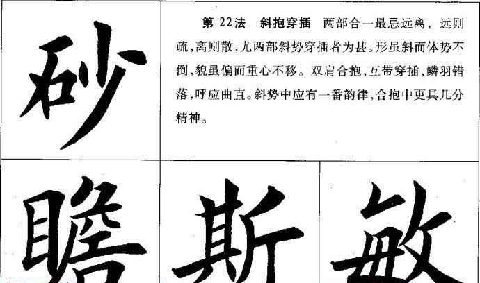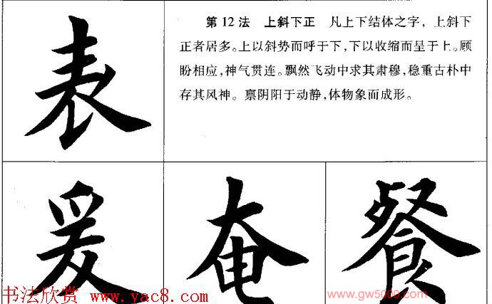 第12法 上斜下正 凡上下结体之字,上斜下正者居多。上以斜势而呼于下,下以收缩而呈于让。顾盼相应,神气贯连。飘然飞动中求其肃穆,稳重古朴中 存于风神。禀阴阳于动静,体物象而成形。