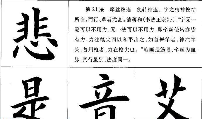 第21法 牵丝粘连 使转粘连,字之精神挽结所在,而行、草者尤甚。清蒋和《书法正宗》云:“字无一笔可以不用力,无一法可以不用力,即牵丝使转亦 皆有力,力注笔尖而以和平出之,如善舞竿者,神注竿头,善用枪者,力在枪尖也。”笔画是筋骨,牵丝为血脉,真行虽别,法度同一。