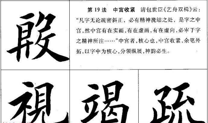 第19法 中宫收紧 清包世臣《艺舟双楫》云:“凡字无论疏密斜正,必有精神挽结之处,是字之中宫,然中宫有在实画,有在虚画,有在虚向,必审于字 之精神所注……”中宫者,核心也,中宫收紧,余笔外拓,以字中为核心,分领纵展,神韵必生。