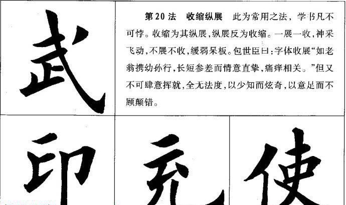 第20法 收缩纵展 此为常用之法,学书凡不可悖。收缩为其纵展,纵展反为收缩。一展一收,神采飞动,不展不收,缓弱呆板。包世臣曰:字体收展“如 老翁携幼孙行,长短参差而情意直挚,痛痒相关。”但又不可肆意挥就,全无法度,以少知而炫奇,以意足而不顾颠错。