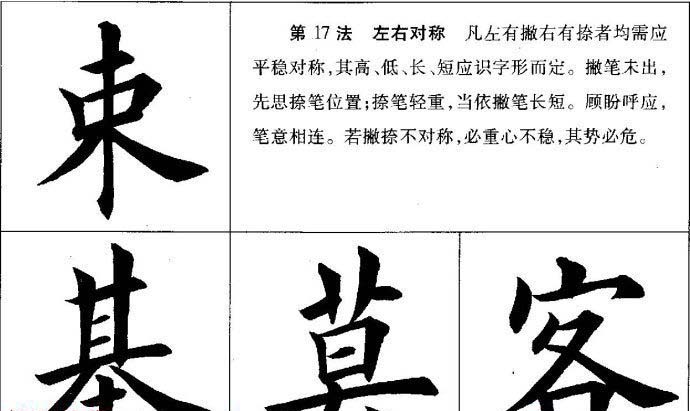 第17法 左右对称 凡左有撇右有捺者均需应平稳对称,其高、低、长、短应识字形而定。撇笔未出,先思捺笔位置;捺笔轻重,当依撇笔长短。顾盼呼应 ,笔意相连。若撇捺不对称,必重心不稳,其势必危。