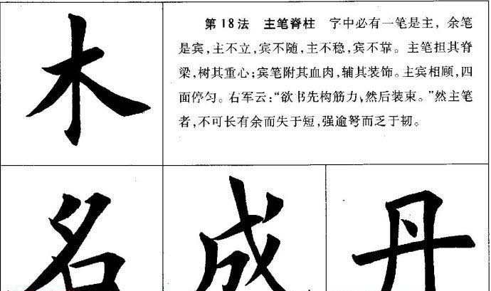 第18法 主笔脊柱 字中必有一笔是主,余笔是宾,主不立,宾不随,主不稳,宾不靠。主笔担其脊梁,树其重心;宾笔附其血肉,辅其装饰。主宾相顾, 四面停匀。右军云:“欲书先构筋力,然后装束。”然主笔者,不可长有余而失于短,强逾弩而乏于韧。