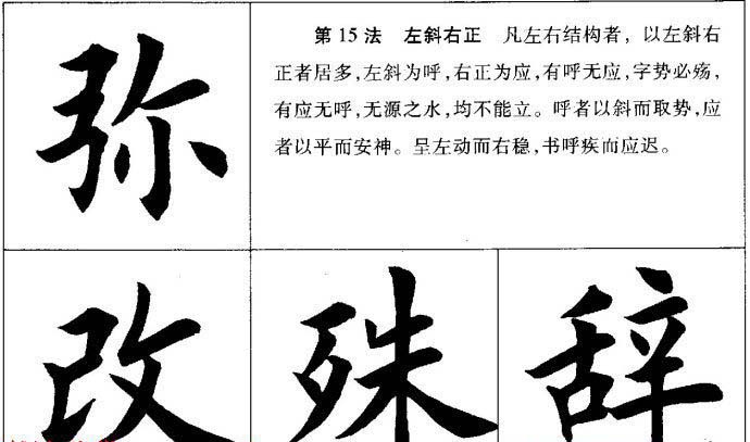 第15法 左斜右正 凡左右结构者,以左斜右正者居多,左斜为呼,右正为应,有呼无应,字势必殇,有应无呼,无源之水,均不能立。呼者以斜而取势, 应者以平而安神。呈左动而右稳,书呼疾而应迟。