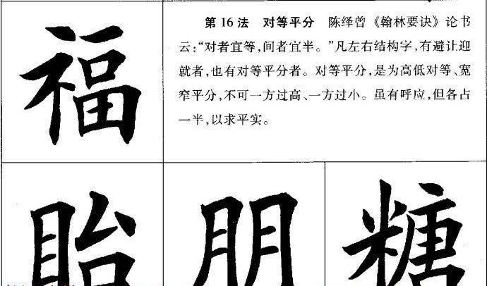 第16法 对等平分 陈绎曾《翰林要诀》论书云:“对者宜等,间者宜半。”凡左右结构字,有避让迎就者,也有对等平分者。对等平分,是为高低对等、 宽窄平分,不可一方过高、一方过小。虽有呼应,但各占一半,以求平实。