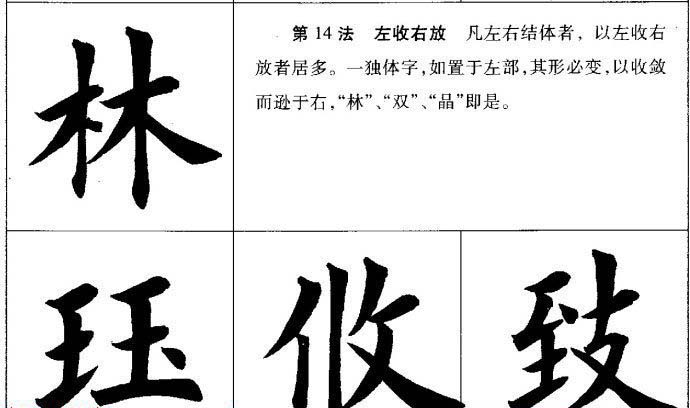 第14法 左收右放 凡左右结体者,以左收右放者居多。一独体字,如置于左部,其形必变,以收敛而逊于右,“林”、“双”、“晶”即是。