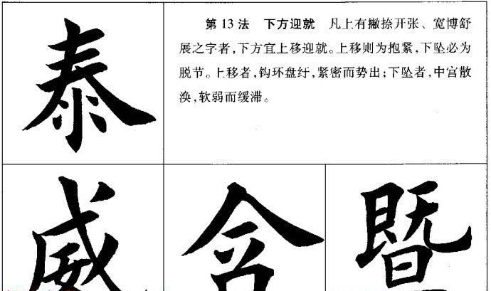 第13法 下方迎就 凡上有撇捺开张、宽博舒展之字者,下方宜上移迎就。上移则为抱紧,下坠必为脱节。上移者,钩环盘纡,紧密而势出;下坠者,中宫 散涣,软弱而缓滞。