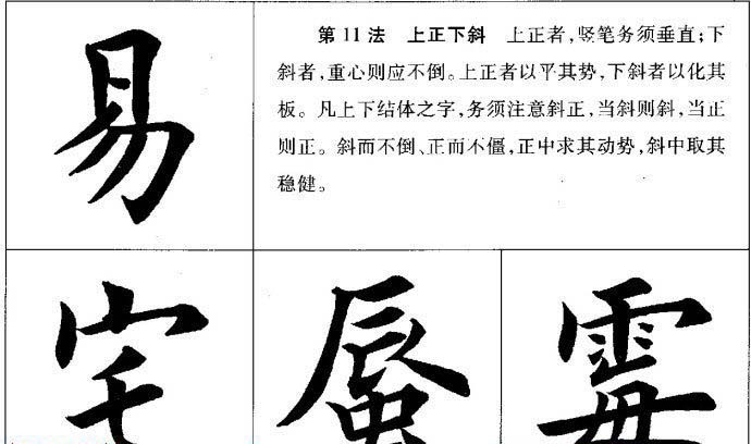 第11法 上正下斜 上正者,竖笔务须垂直;下斜者,重心则应不倒。上正者以平其势,下斜者以化其板。凡上下结体之字,务须注意斜正,当斜则斜,当 正则正。斜而不倒、正而不僵,正中求其动势,斜中取其稳健。