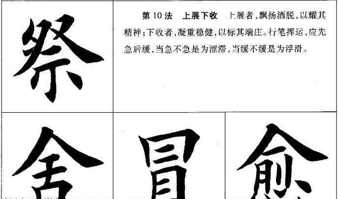 第10法 上展下收 上展者,飘扬洒脱,以耀其精神;下收者,疑重稳健,以标其端庄。行笔挥运,应先急后缓,当急不急是为涩滞,当缓不缓是为浮滑。
