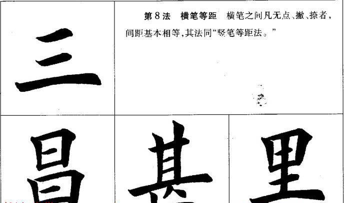 第7法 横笔等距 横笔之间凡无点、撇、捺者,间距基本相等,其法同“竖笔等距法。”