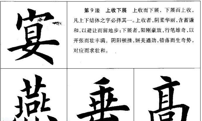 第9法 上收下展 上收而下展,下展而上收,凡上下结体之字必择其一。上收者,阴柔华丽,涵蓄谦和,以避让而留地步;下展者,阳刚豪放,行笔雄奇 ,以开张而壮丰满。阴阳顿挫,妍美遒劲,错落而生奇势,对应而求壮和。