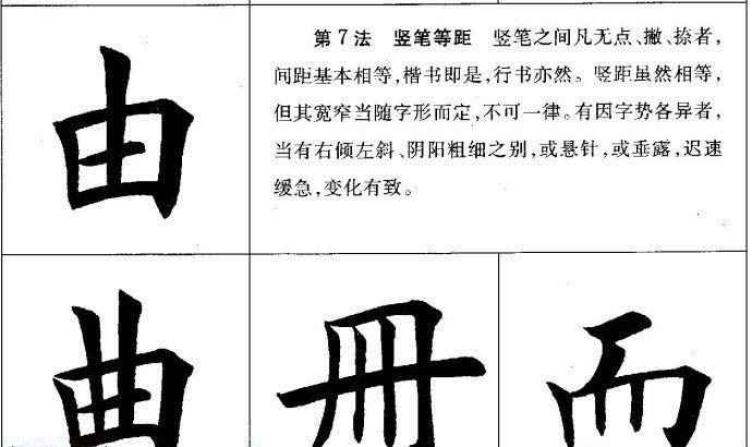 第8法 竖笔等距 竖笔之间凡无点、撇、捺者,间距基本相等,楷书即是,行书亦然。竖距虽然相等,但其宽窄当随字形而定,不可一律。有因字势各异 者,当有右倾左斜、阴阳粗细之别,或悬针,或垂露,迟速缓急,变化有致。