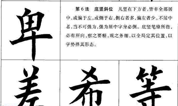 第6法 底竖斜位 凡竖在下方者,皆非全部居中,或偏于左,或侧于右,侧右者多,偏左者少。不居中者,当不可强为,强为居中字身必倒。底竖笔锋所 指,必有所向,察之要精,观之务细,以全局定其位置,以字势择其形态。