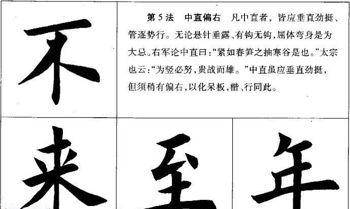 第5法 中直偏右 凡中直者,皆应垂直劲挺、管逐势行。无论悬针垂露、有钩无钩,屈体弯身是为大忌。右军论中直曰:“紧如春笋之抽寒谷是也。”太 宗也云:“为竖必努,贵战而雄。”中直虽应垂直劲挺,但须稍有偏右,以化呆板,楷、行同此。