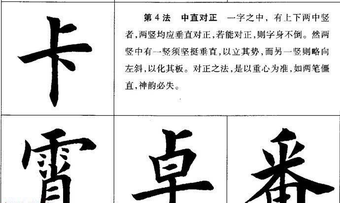 第4法 中直对正 一字之中,有上下两中竖者,两竖均应垂直对正,若能对正,则字身不倒。然两竖中有一竖须坚挺垂直,以立其势,而另一竖则略向左 斜,以化其板。对正之法,是以重心为准,如两笔僵直,神韵必失。