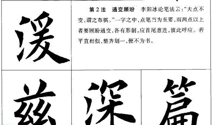 第2法 通变顾盼 李阳冰论笔法云:“夫点不变,谓之布棋。”一字之中,点笔当为至要,而两点以上者要顾盼通变,各有形制,应首尾意连,彼此呼应 。若平直相似,整齐划一,便不为书。