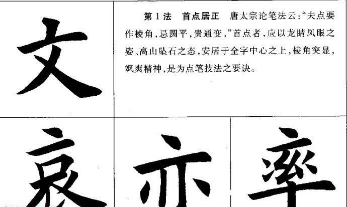 第1法 首点居正 唐太宗论笔法云:“夫点要作棱角,忌圆平,贵通变,”首点者,应以 龙睛凤眼之姿、高山坠石之态,安居于全字中心之上,棱角突显 ,飒爽精神,是为点笔技法之要诀。