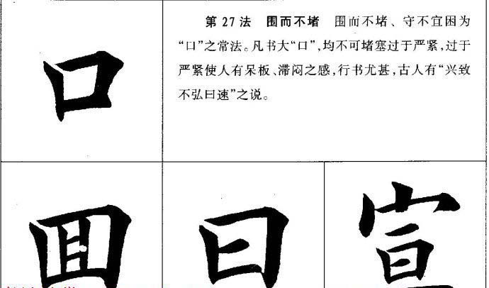第27法 围而不堵 围而不堵、守不宜困为“口”之常法。凡书大“口”,均不可堵塞过于严紧,过于严紧使人有呆板、滞闷之感,行书尤甚, 古人有“兴致不弘曰速”之说。