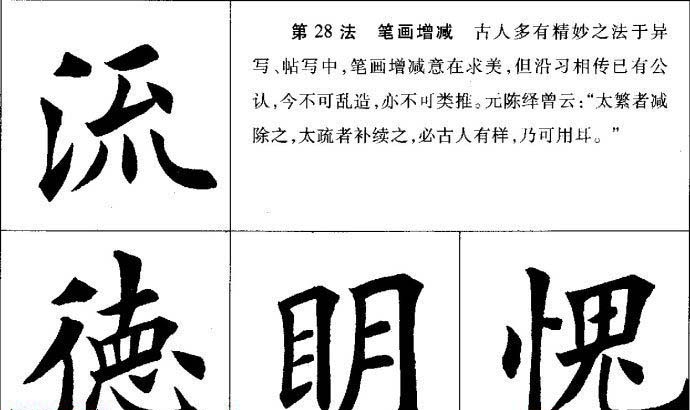 第28法 笔画增减 古人多有精妙之法于异写、帖写中,笔画增减意在求美,但沿习相传已有公认,今不可乱造,亦不可类推。元陈绎曾云:“ 太繁者减除之,太疏者补续之,必古人有样,乃可用耳。”