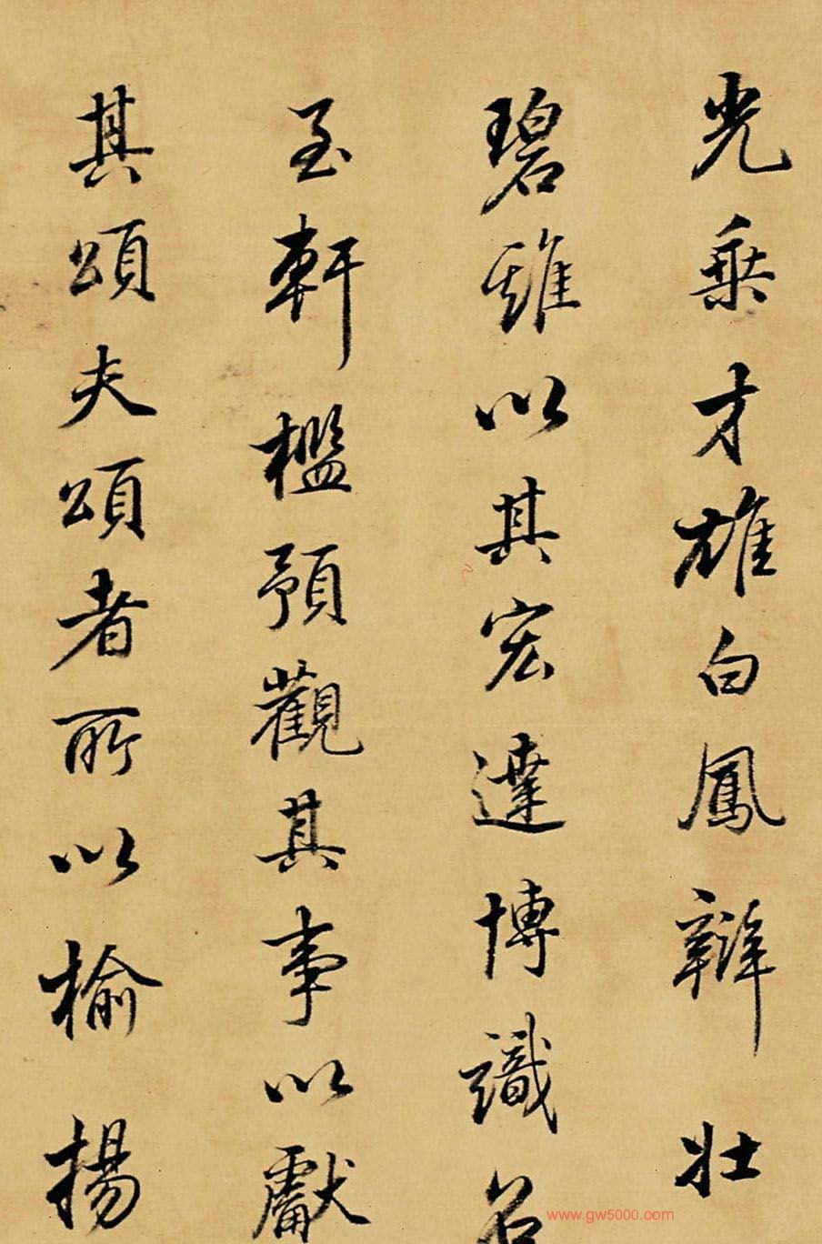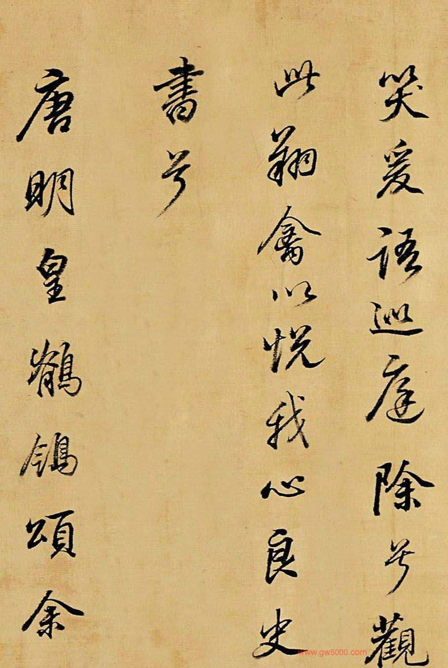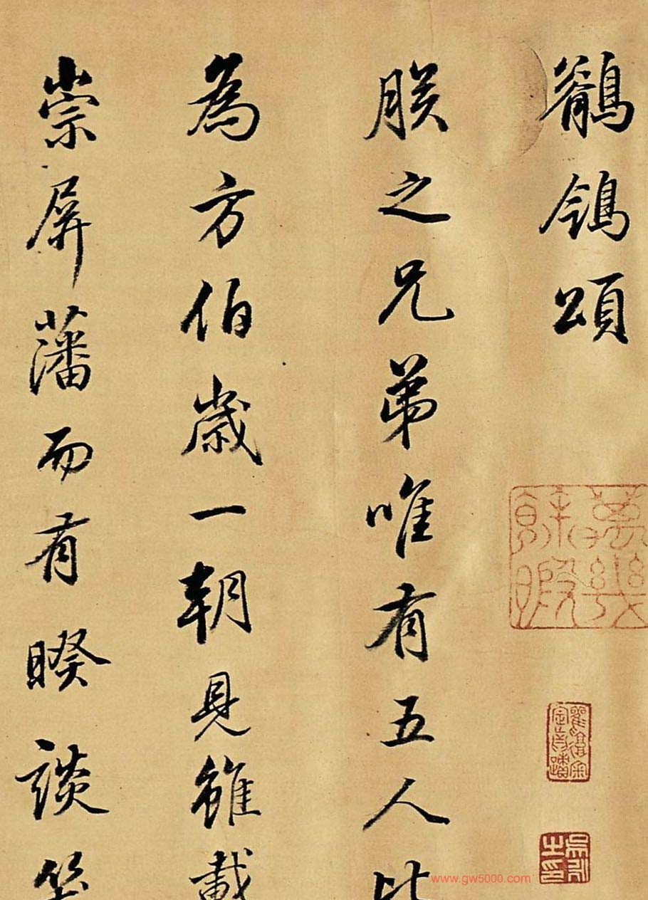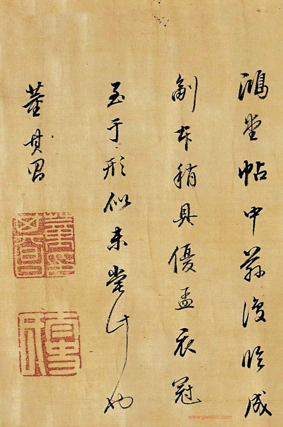 董其昌书法作品赏析《临唐明皇鹡鸰颂》绫本手卷,纵29.5厘米,橫245厘米,共五十行。款曰:“唐明皇鹡鸰颂,余侍东宫讲读时曾从内库一见真迹。其英伟之概不减太宗,而遒劲不无少逊。余近于新都汪景淳得摹,已刻入鸿堂帖中,兹复临成副本,稍具优孟衣冠,至于形似未尝计也。董其昌。”钤白文印“董其昌”、“太史氏”。另有收藏印“万机馀暇”、“观复审定真迹”、“吴永之印”。