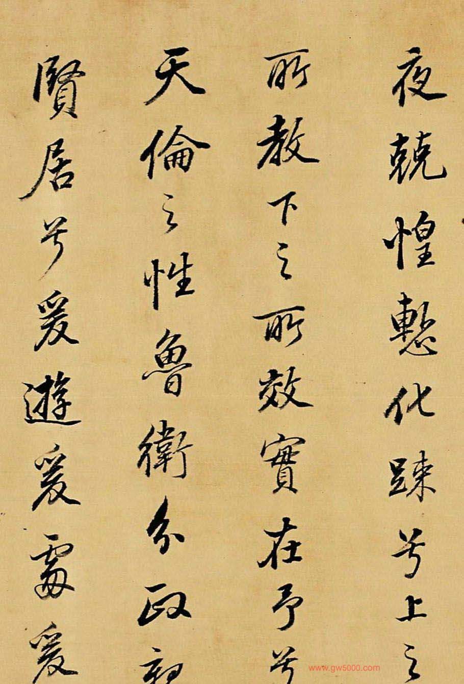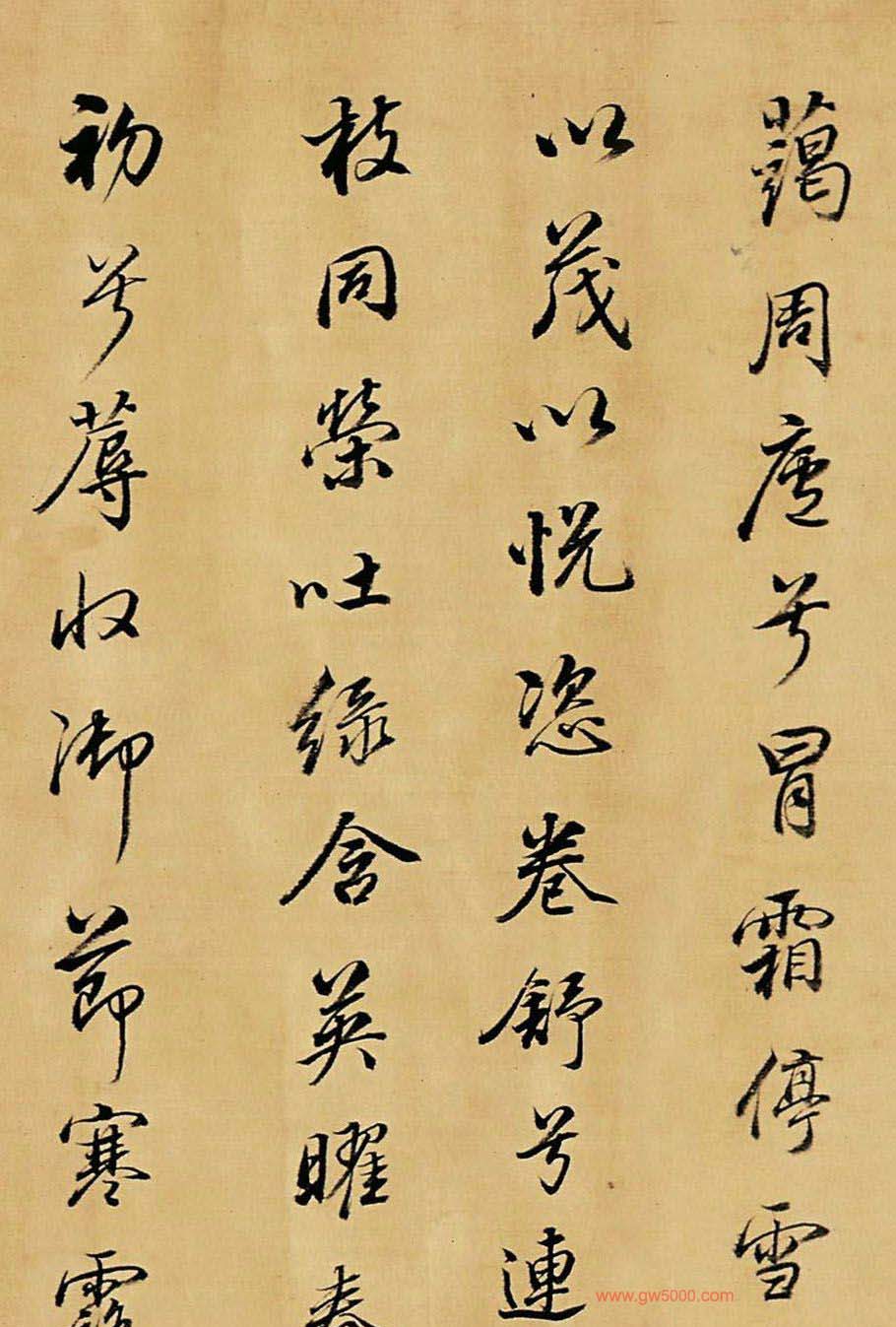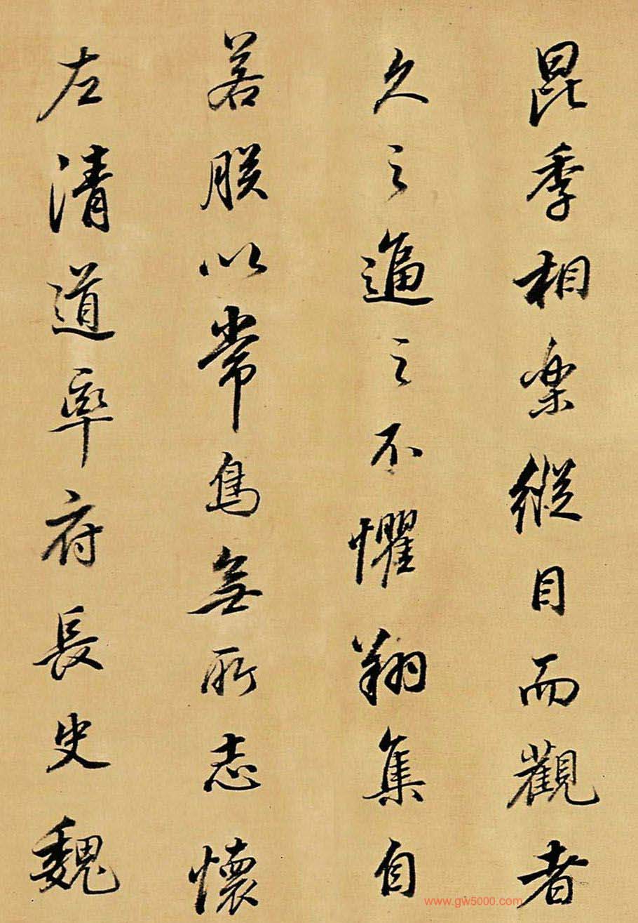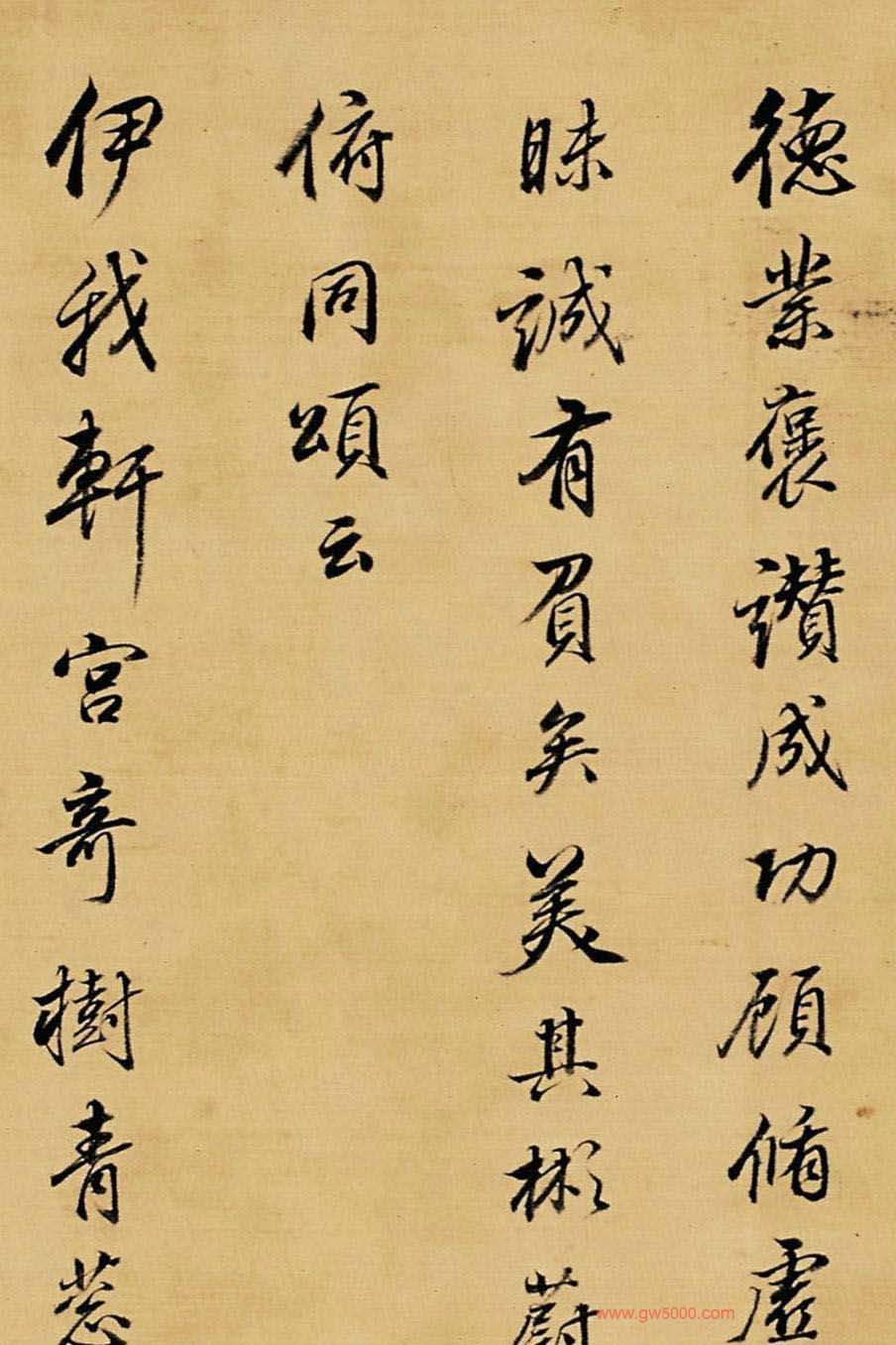 董其昌书法作品赏析《临唐明皇鹡鸰颂》绫本手卷,纵29.5厘米,橫245厘米,共五十行。款曰:“唐明皇鹡鸰颂,余侍东宫讲读时曾从内库一见真迹。其英伟之概不减太宗,而遒劲不无少逊。余近于新都汪景淳得摹,已刻入鸿堂帖中,兹复临成副本,稍具优孟衣冠,至于形似未尝计也。董其昌。”钤白文印“董其昌”、“太史氏”。另有收藏印“万机馀暇”、“观复审定真迹”、“吴永之印”。