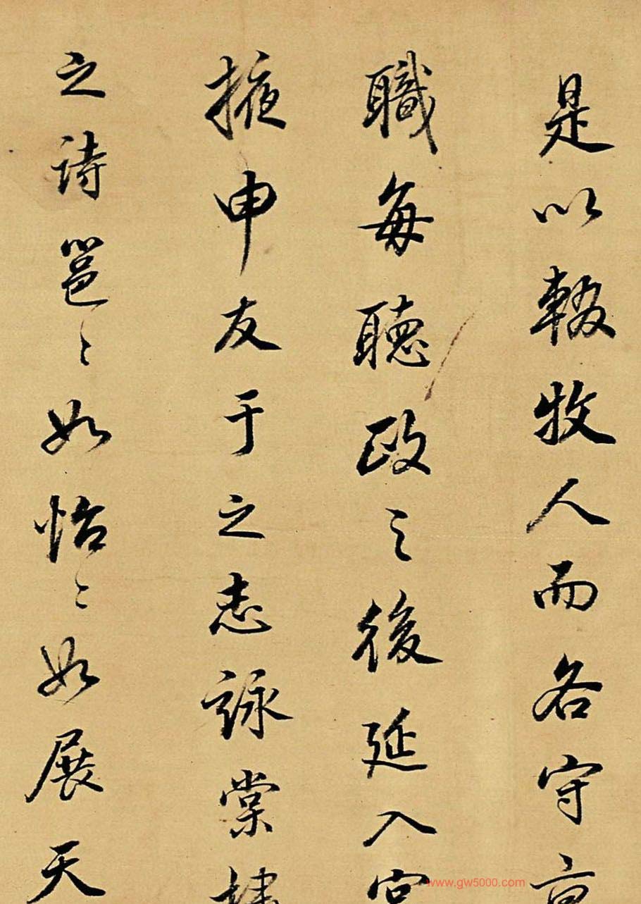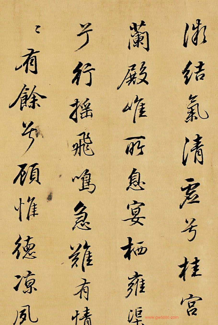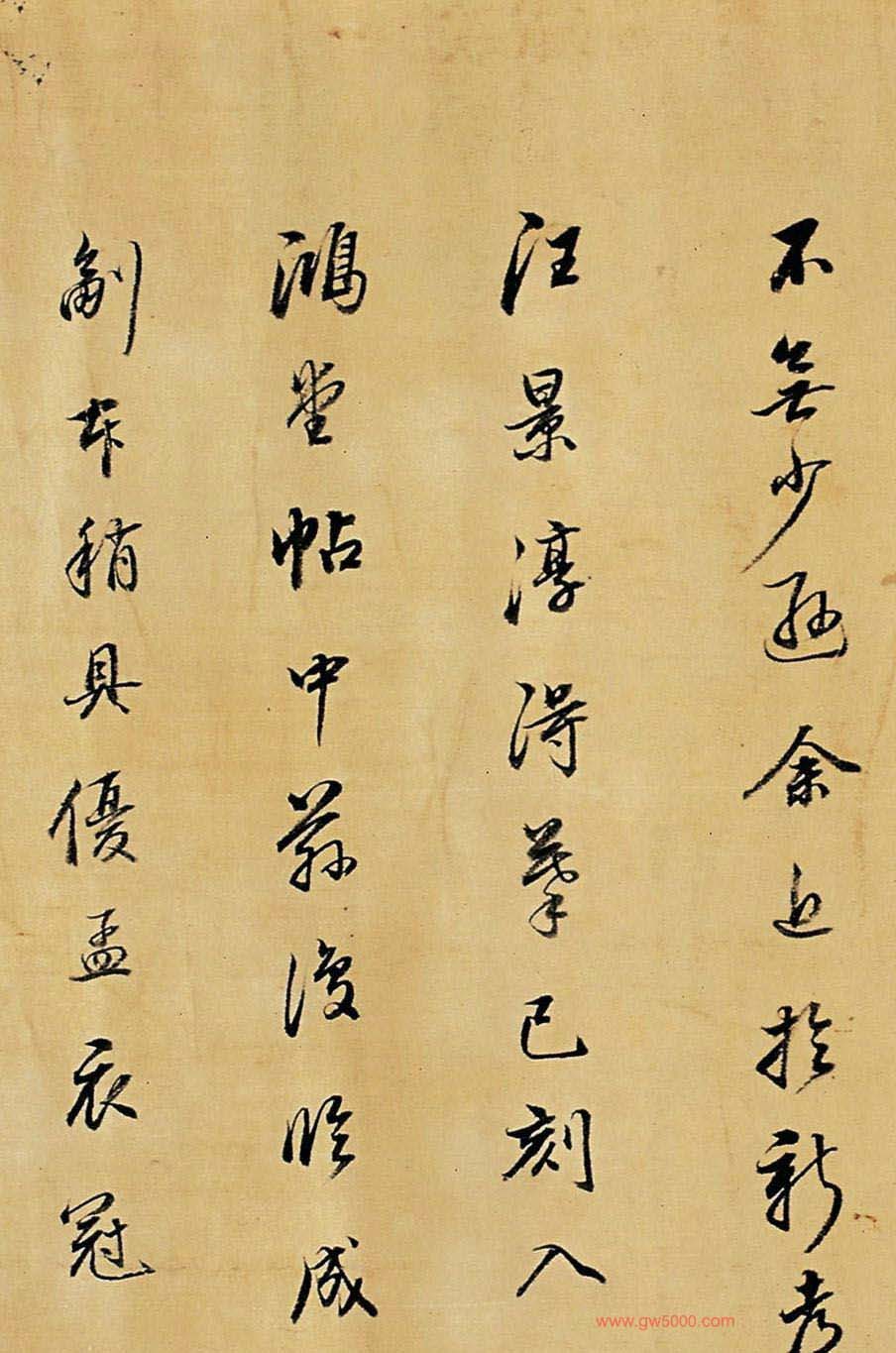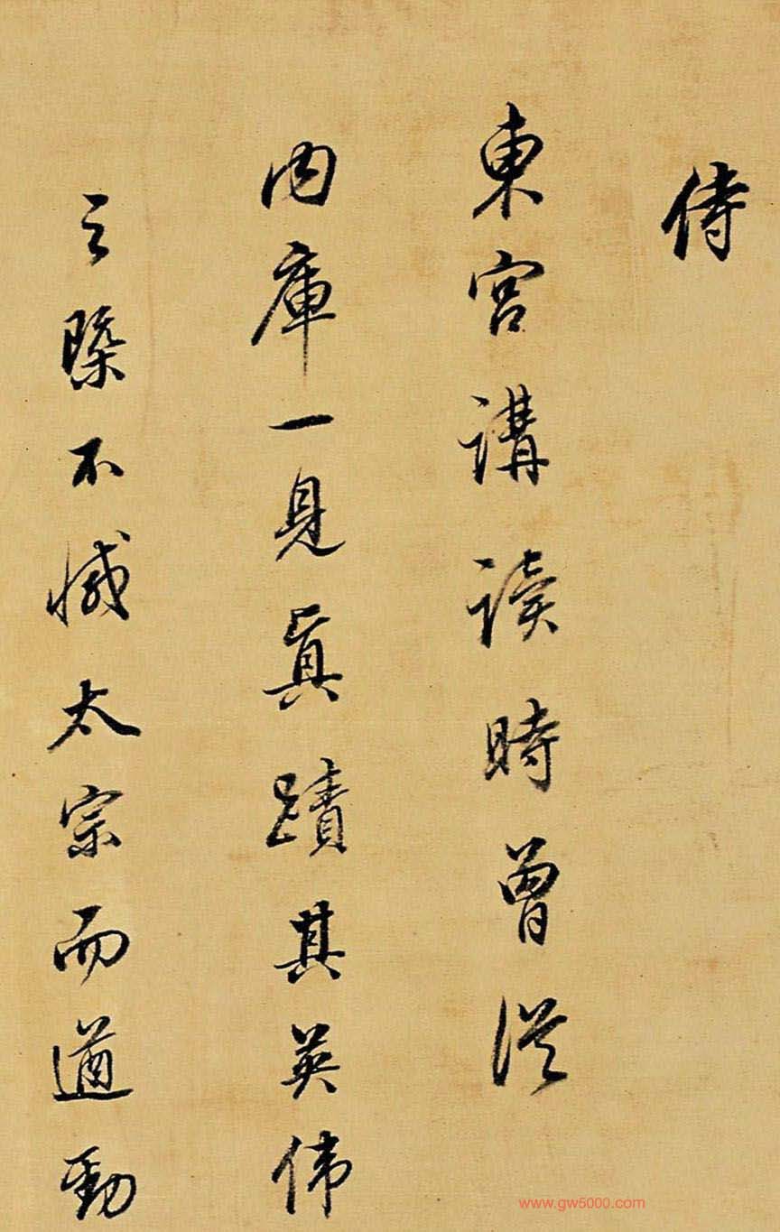 董其昌书法作品赏析《临唐明皇鹡鸰颂》绫本手卷,纵29.5厘米,橫245厘米,共五十行。款曰:“唐明皇鹡鸰颂,余侍东宫讲读时曾从内库一见真迹。其英伟之概不减太宗,而遒劲不无少逊。余近于新都汪景淳得摹,已刻入鸿堂帖中,兹复临成副本,稍具优孟衣冠,至于形似未尝计也。董其昌。”钤白文印“董其昌”、“太史氏”。另有收藏印“万机馀暇”、“观复审定真迹”、“吴永之印”。