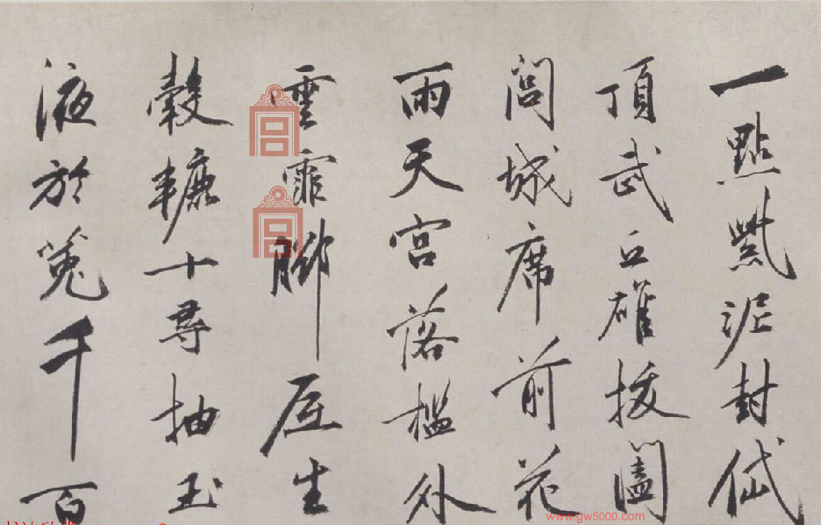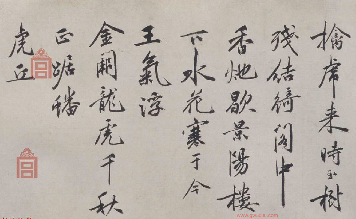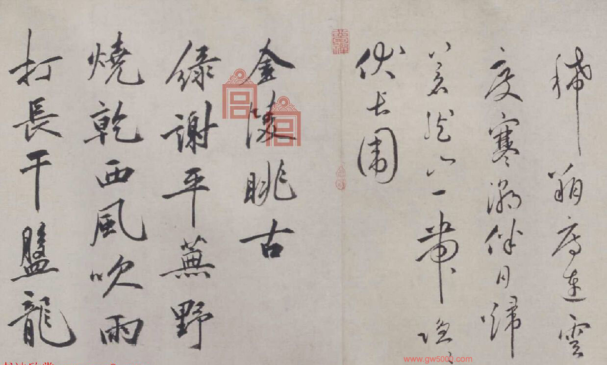 青霞抱琳馆,罗阴络深迳。龟游烟沼煖鹤立天坛净。微香拂幽洞,欲觅风不定。云房并悬帘,昼日锁虚静。琪殿临高台,时闻落瑶磬。循除步周匝,徧扣无人应。杂诗数章书似仲瞻文学聊付一笑,庚午上元日,枝山道者祝允明。