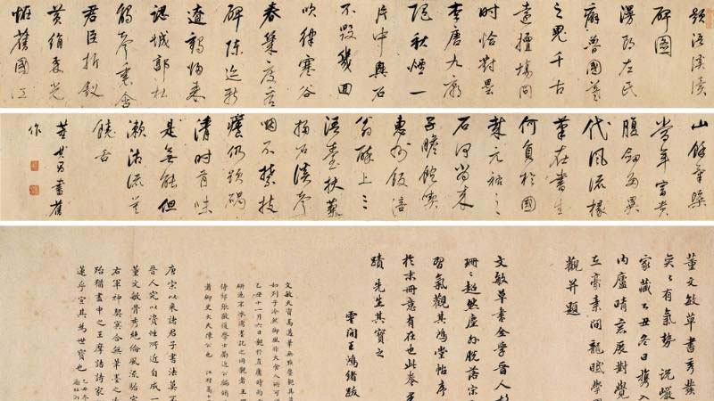 明代董其昌书法手卷作品欣赏《题浯溪读碑图》纸本,印鉴:玄赏斋、董其昌印、知制诰日讲官。