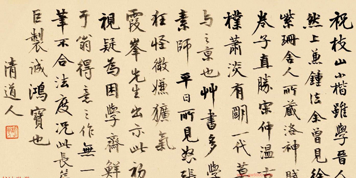 李瑞清书法题跋:祝枝山小楷,虽学晋人,然上兼钟法,余曾见徐紫珊舍人所藏《洛神赋》卷子,直胜宋仲温,古朴萧淡,有明一代莫与之京也。草书多学素师,平日所见怒张狂怪,微嫌犷气。霞峰先生出示此,初视疑为困学斋鲜于翁得意之作,无一笔不合法度,况此长篇巨制,诚鸿宝也。清道人。