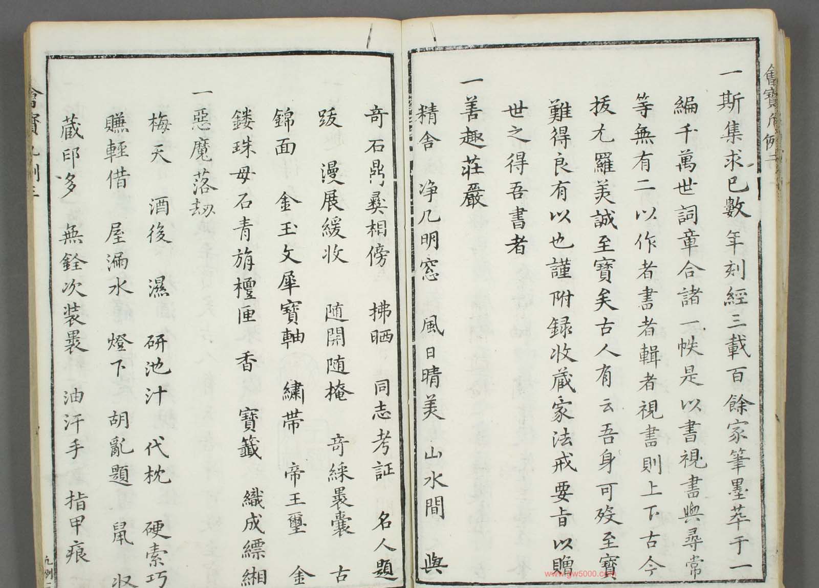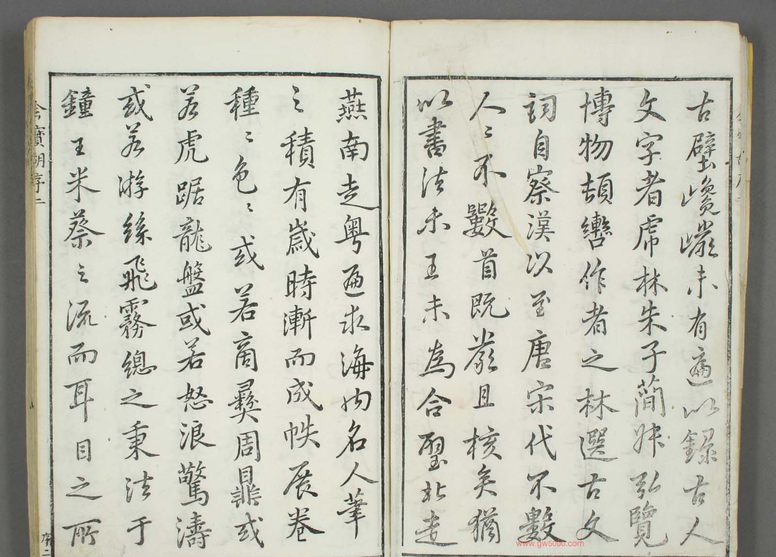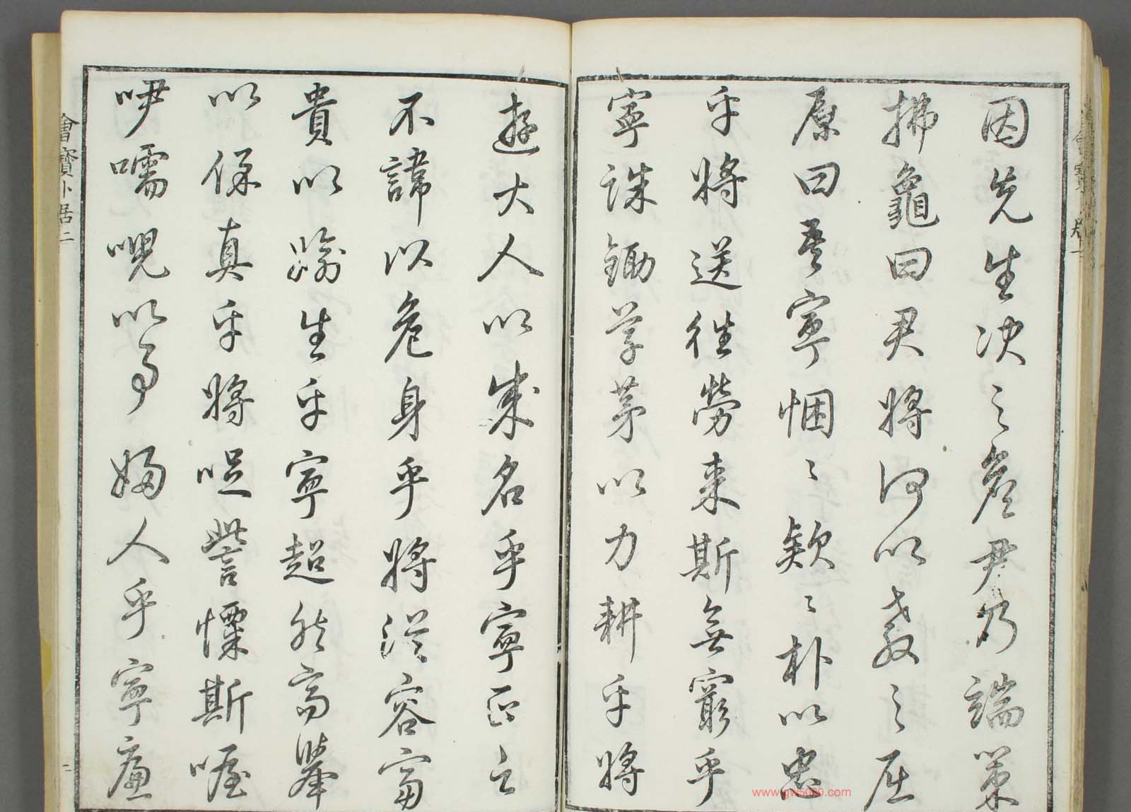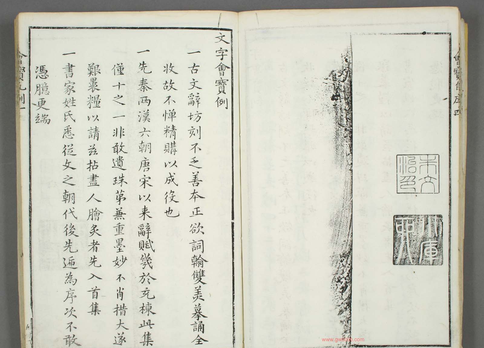 《文字会宝》共十册,取前代之文,浼善书者书之,人各一篇,裒而成集。此书取前代之文,上溯屈原、下逮苏轼,请善书者如董其昌、陶望龄、黄汝亨等一百余人书之,人各一篇,书家姓氏悉从文之朝代先后为次序,刻印精美,别具一格。正如序言中所说:“是编萃于千载之绮章,合一代之名墨,是龙凤水陆之珍也”。