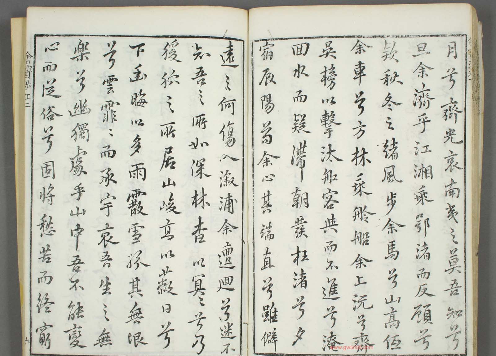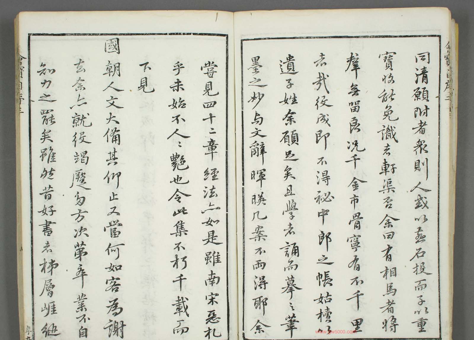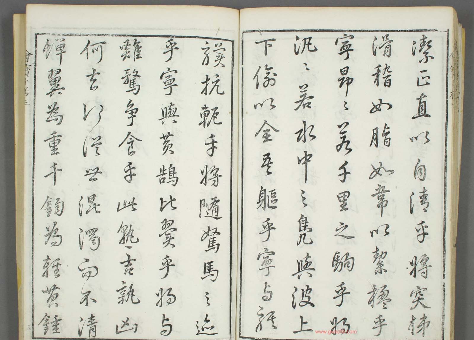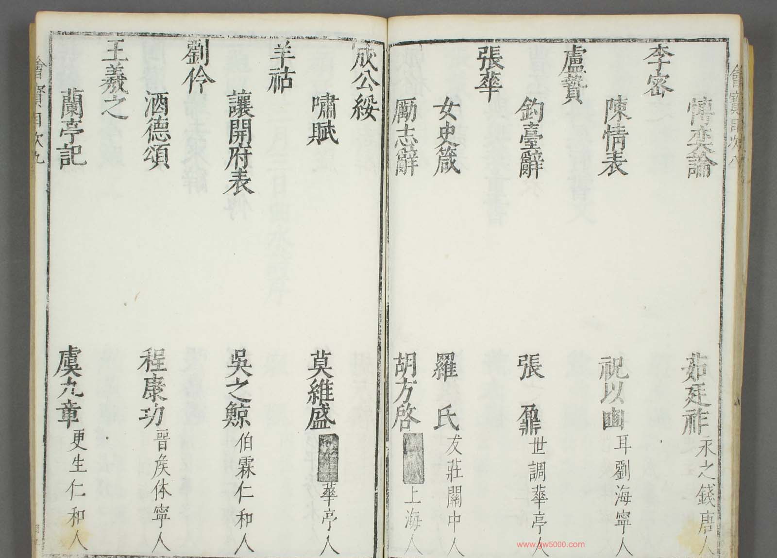《文字会宝》共十册,取前代之文,浼善书者书之,人各一篇,裒而成集。此书取前代之文,上溯屈原、下逮苏轼,请善书者如董其昌、陶望龄、黄汝亨等一百余人书之,人各一篇,书家姓氏悉从文之朝代先后为次序,刻印精美,别具一格。正如序言中所说:“是编萃于千载之绮章,合一代之名墨,是龙凤水陆之珍也”。