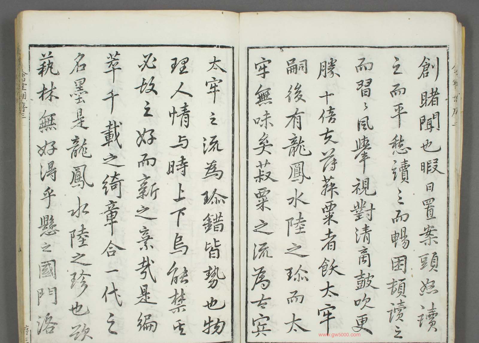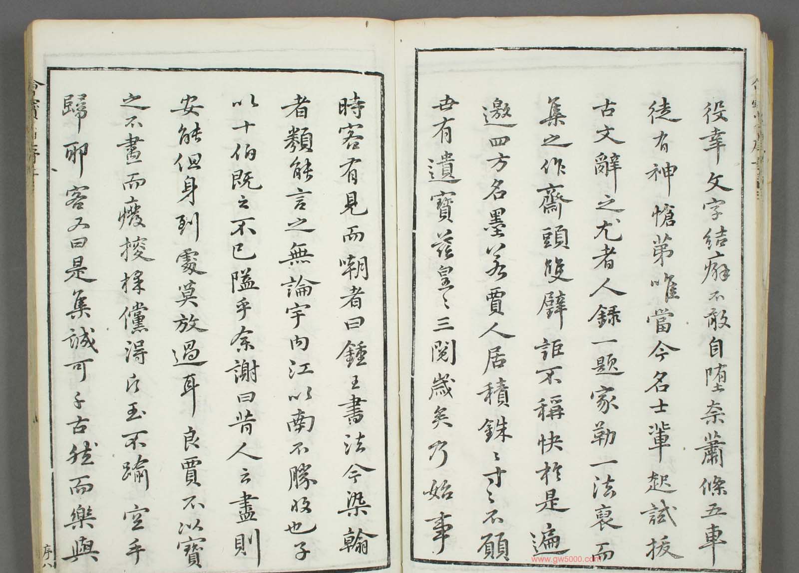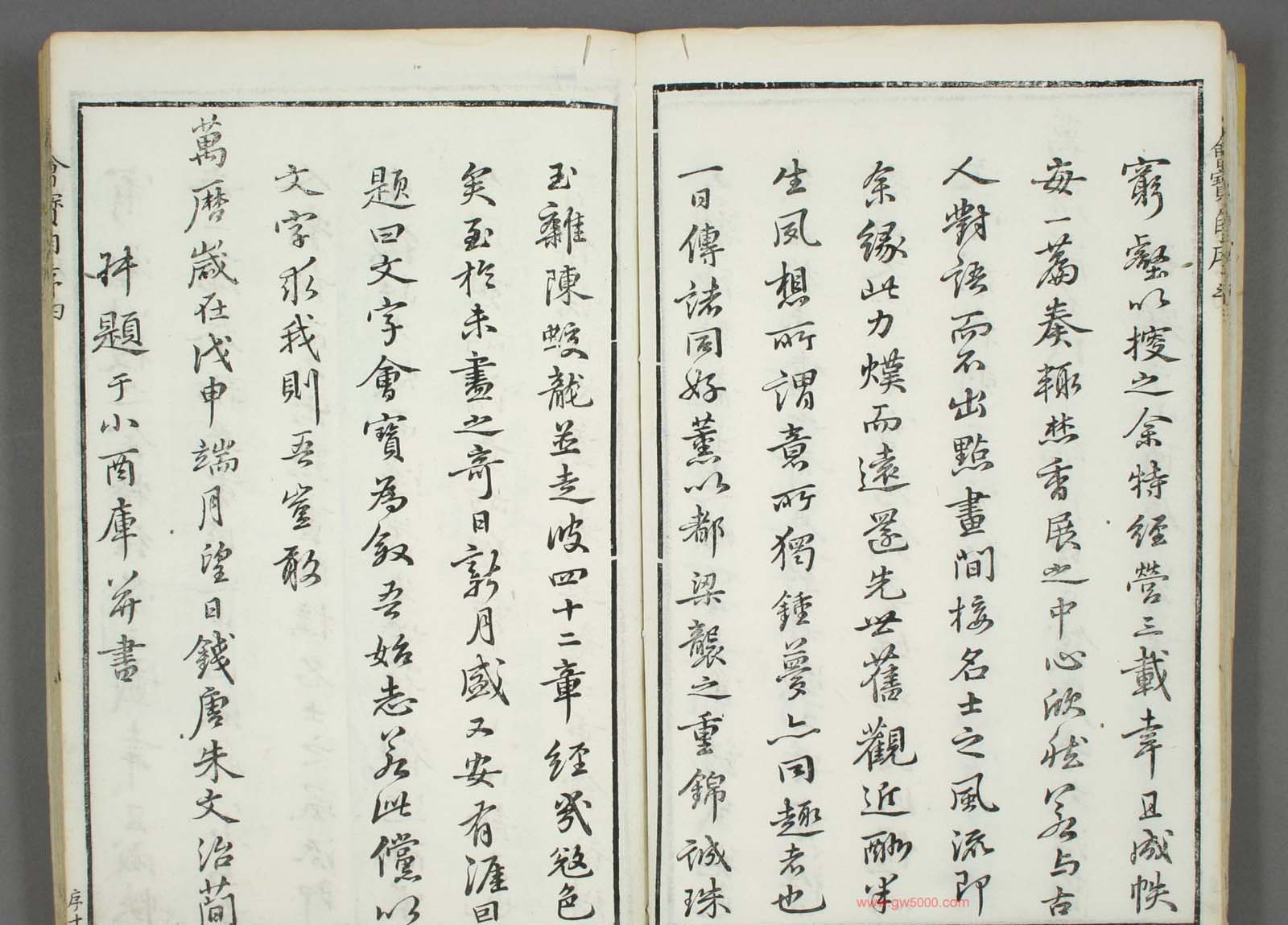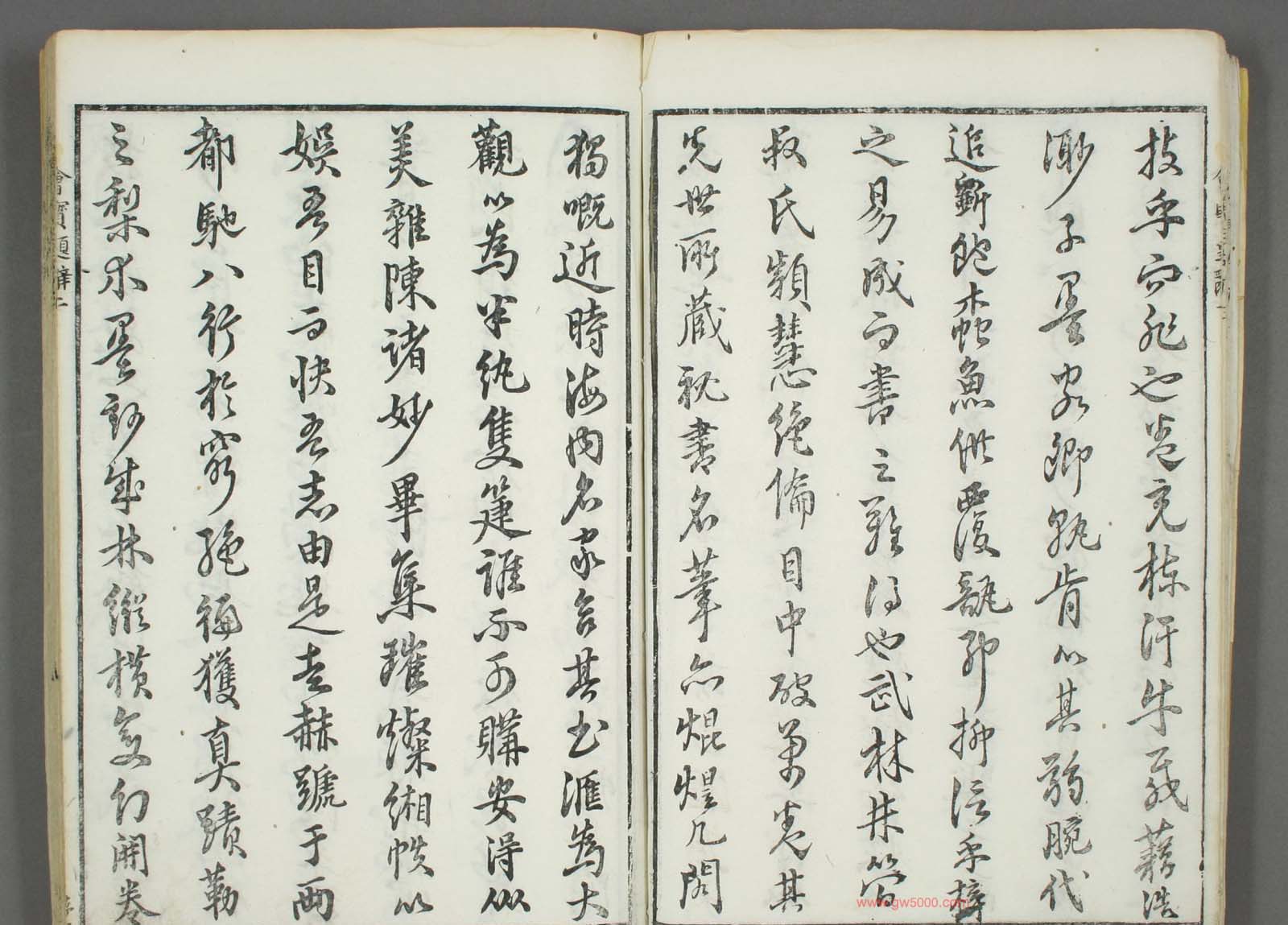 《文字会宝》共十册,取前代之文,浼善书者书之,人各一篇,裒而成集。此书取前代之文,上溯屈原、下逮苏轼,请善书者如董其昌、陶望龄、黄汝亨等一百余人书之,人各一篇,书家姓氏悉从文之朝代先后为次序,刻印精美,别具一格。正如序言中所说:“是编萃于千载之绮章,合一代之名墨,是龙凤水陆之珍也”。