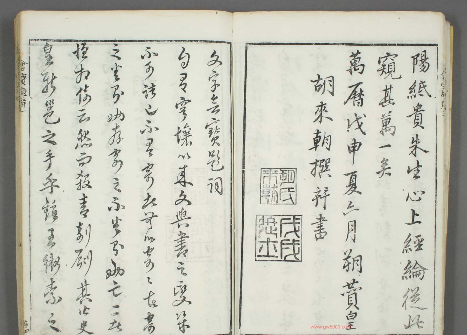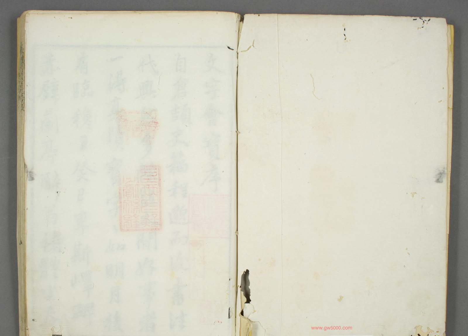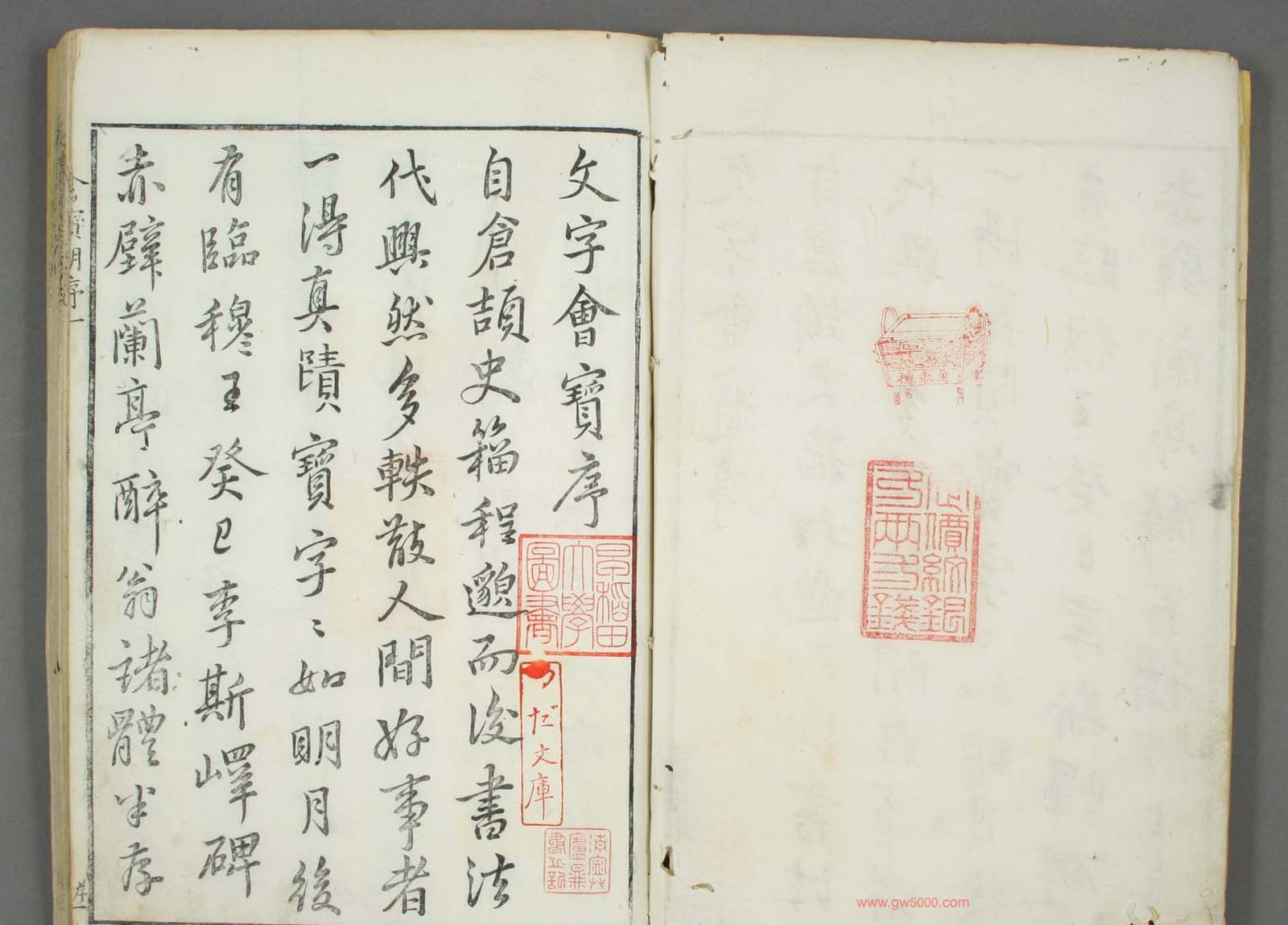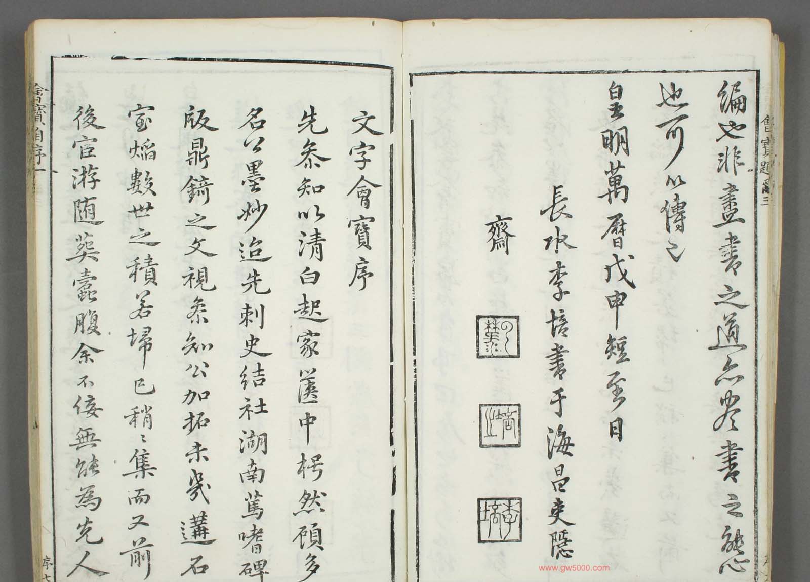 卷前有明万曆间胡来朝、聂心汤、李培及作者序文,次《文字宝会例》。是书为白棉纸印本,开本阔朗,通篇写刻上板,字数行款不同,字体风格不一,乃书法之佳作。
