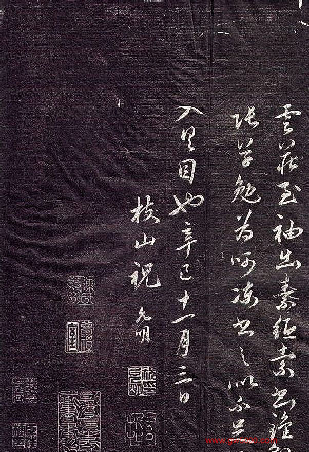 明代祝允明作小章草书法《陶渊明闲情赋》拓本,明武宗正德十六年辛巳(1521年),祝允明时年六十二岁,自识云:“冬日,拥炉于小闾,过云庄至,除素纸索书钟繇张草,勉为呵冻手书之。”辛巳十一月三日,枝山祝允明