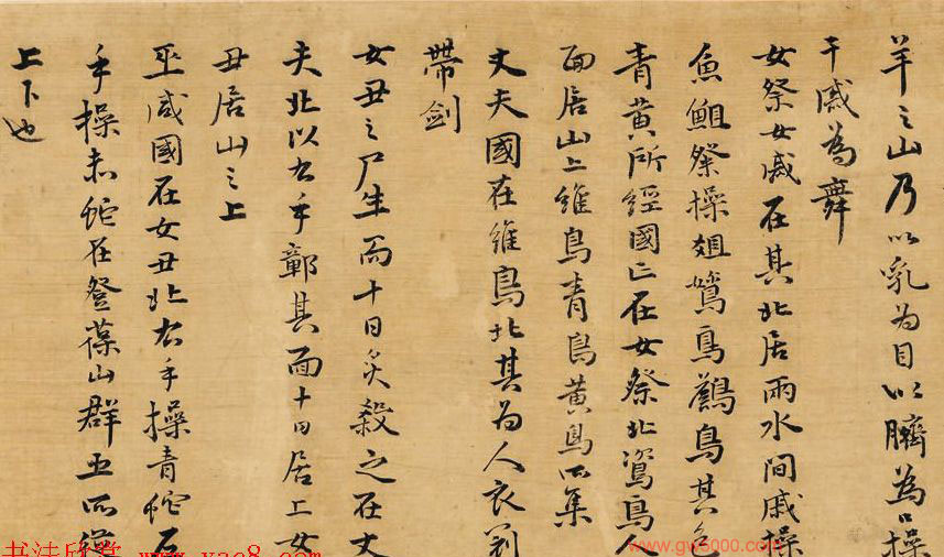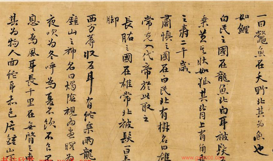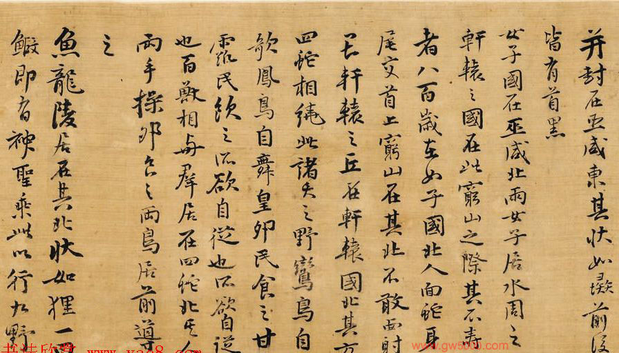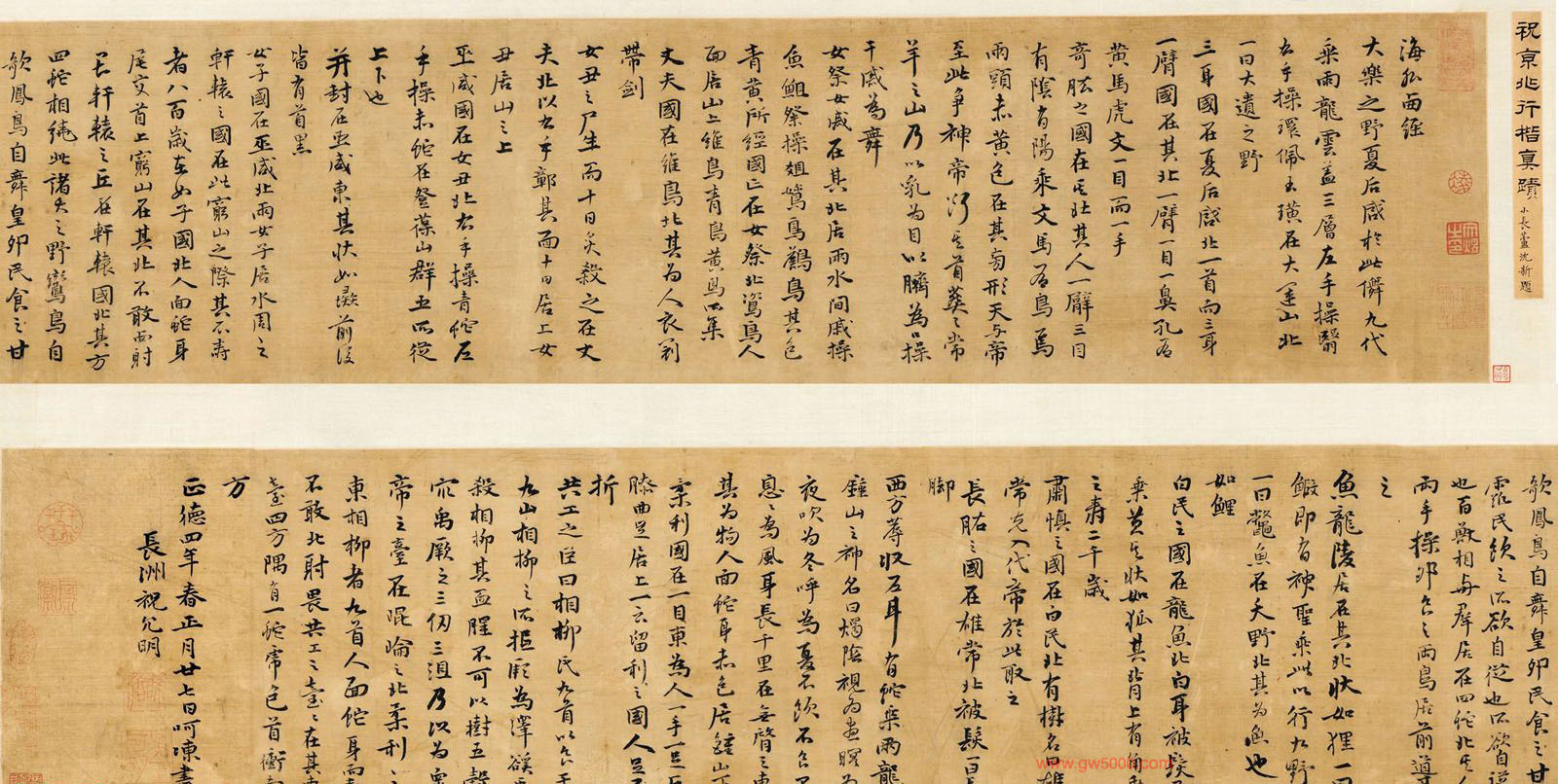 明代祝允明行楷书法作品鉴赏《海外西经卷》,手卷绢本,18.5×152.5cm,正德四年(1509)作,嘉德2013秋拍,成交价1035万元。