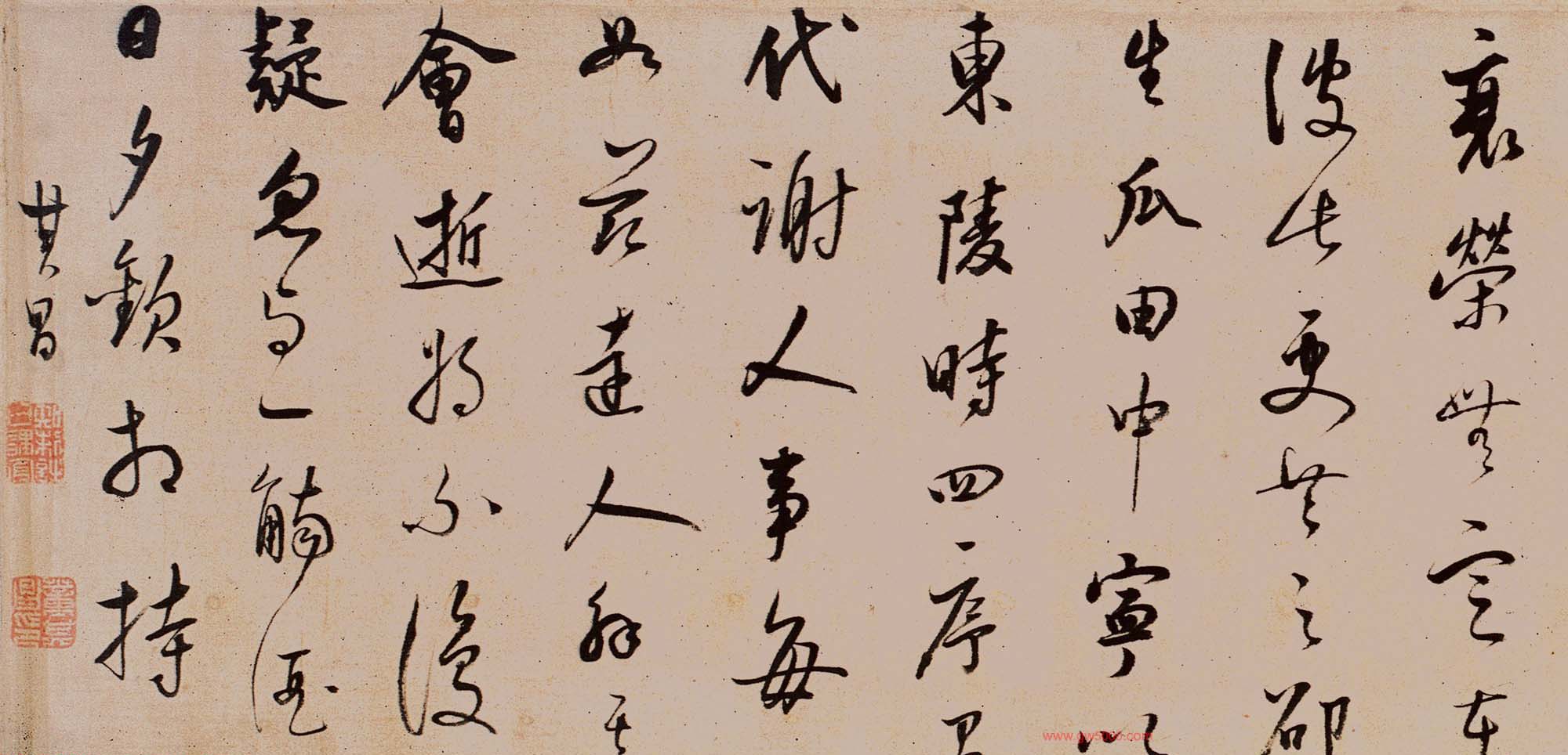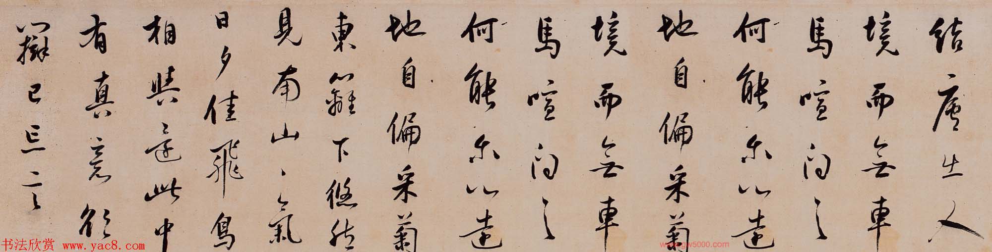 董其昌行草书法作品欣赏《陶渊明饮酒诗四首卷》,高清彩色高清TIF下载,尺寸:25x269厘米,像素:31812x2953,大小:358MB。