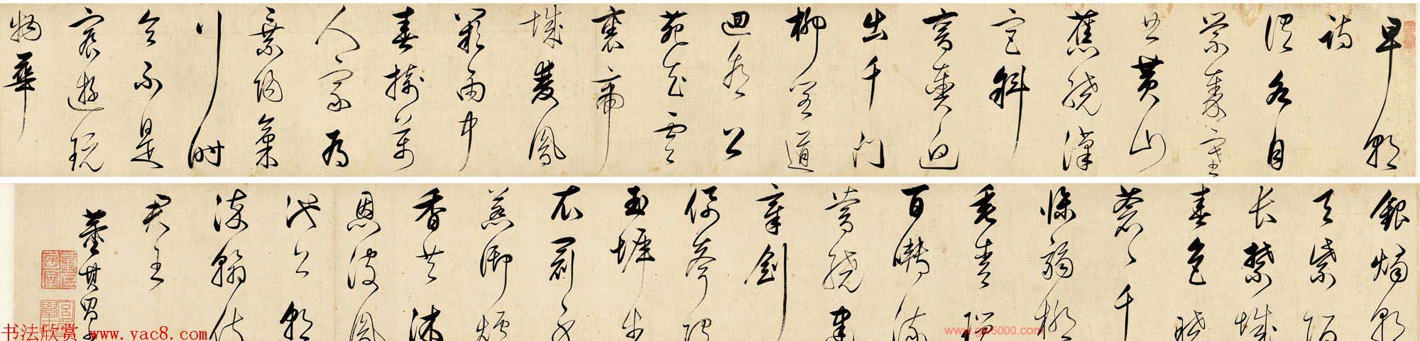 明代董其昌草书手卷赏析《早朝诗》,尺寸:29.2×463厘米,钤印:董氏玄宰、宫詹学士、玄赏斋。嘉德2012春拍,成交价80.5万元。